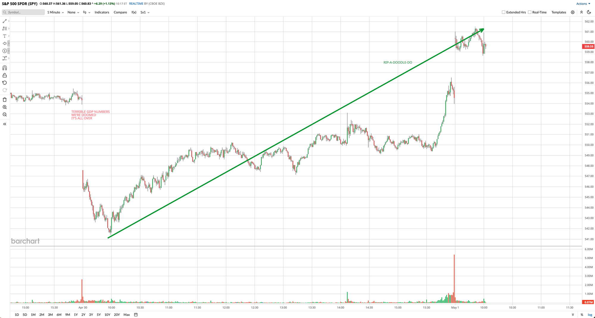 If you dug deeper into the GDP numbers, squinted, stood on your hands and sang Play Misty For Me then you could probably convince yourself that in fact the bad number was a good number and so on and so forth. Doesn’t matter. This is all that matters: