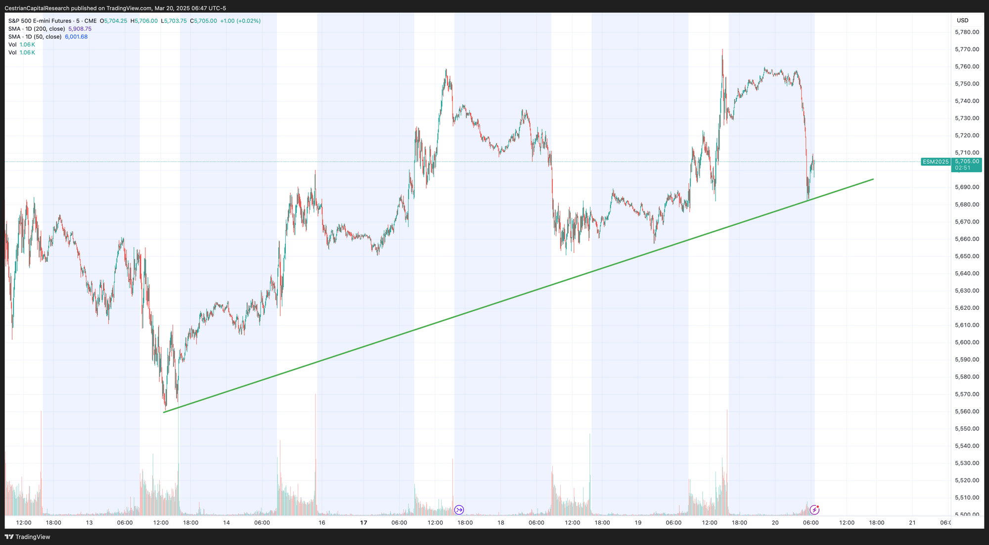The market response to Powell was initially bullish although not wildly so - the highs of Tuesday were not breached on Wednesday. There is some weakness in the pre-market session but nothing ruinous so far. Here’s S&P500 e-mini futures (ES) for instance.