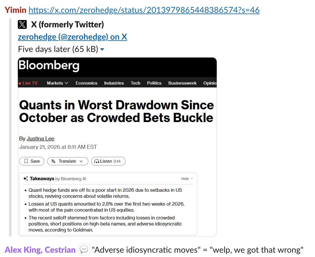 At present we are enjoying great success with our algorithmic services - so far they have yet to be hit by any, er, “adverse idiosyncratic moves” - for anyone who wants to reduce their workload by outsourcing it to the machine, these are wonderful services to have. SignalFlow Growth is now up some 73% from 1 January 2025 to date, vs. a little over 16% for the S&P500. And all it does is pick three ETFs every now and then. (Its Ph.D author tells me there is a little more depth to it than that by the way, but as far as the actionable output, nine characters per day is all you have to read).