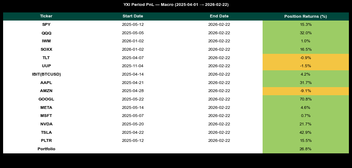 For single-stock investing and trading in the top names, don’t miss out on our YXI Systematic Signals service. This service is extremely easy to use. Each morning, before the New York open, you receive a simple set of signals for each of the 15 tickers it covers - these are all highly liquid stocks and ETFs. A signal of “1” means “buy” or “hold” (if the signal was 0 yesterday it means buy, if it was 1 yesterday, it means hold). A signal of “0” means “sell” or “do nothing” (if the signal was 1 yesterday it means sell, if it was 0 yesterday it means do nothing). You can do with these signals what you will - trade them mechanically, factor them into your own analysis - whatever. But if you had traded them mechanically from inception, this is what the model has achieved: