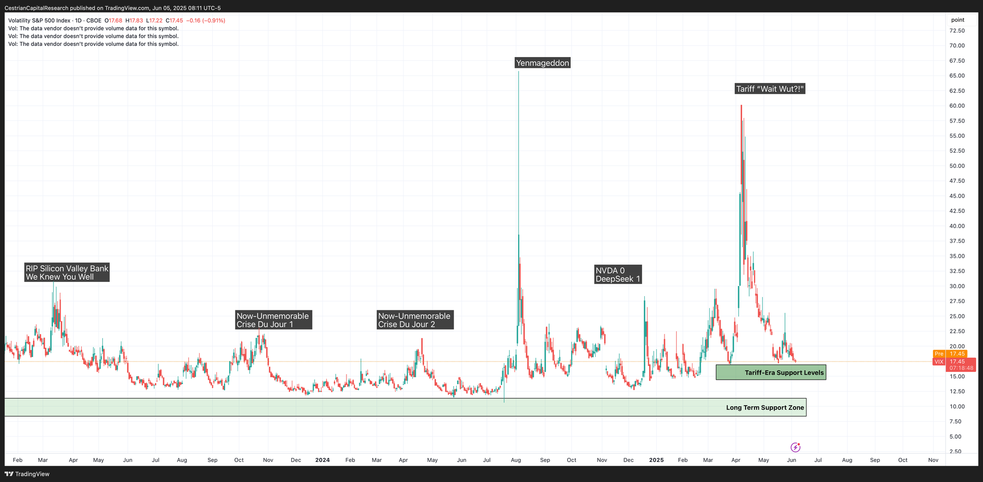 But for me, it starts with the Vix. How can you estimate when a correction may come along? When the Vix is on the floor. Low demand for >30DTE S&P500 puts, investors asleep at the wheel. And when might a royal dump find its footing and turn into a buyable dip? When the Vix is on the moon. All anyone wants to buy is puts. You still have to do all the other work but for me? The analysis starts with the Vix.