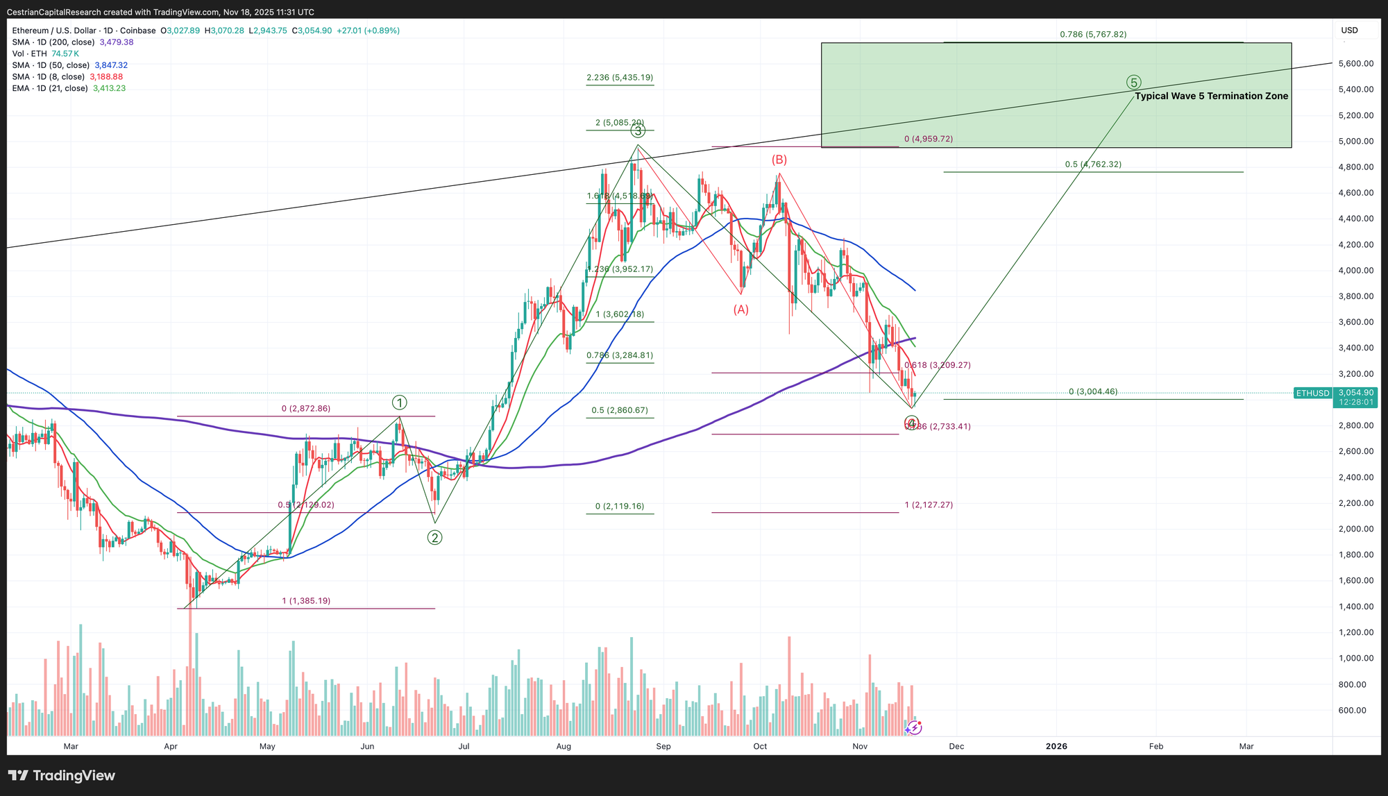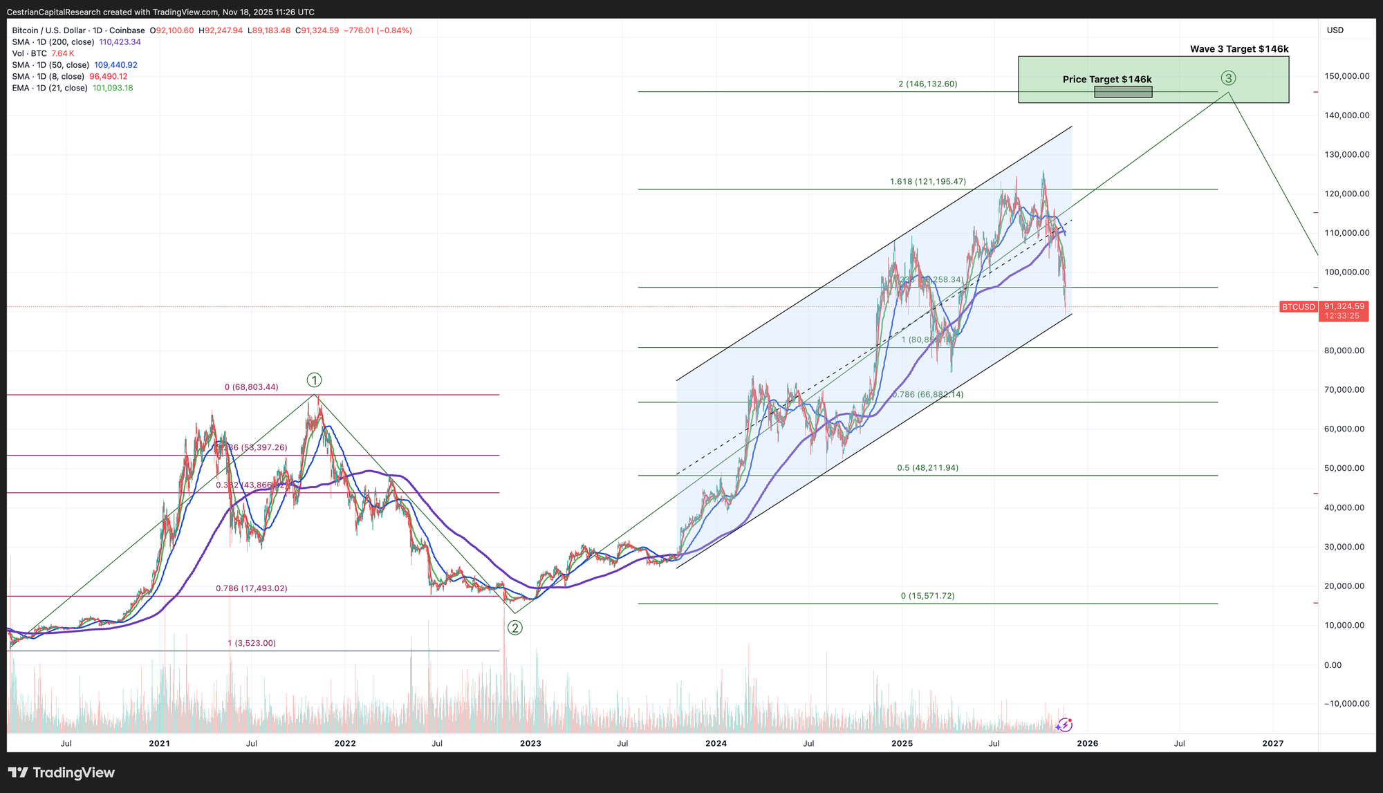 Apologies for the messy chart. The A-B-C is intended to show a potential bear path if that current “support” line gives way, and the green up & red down wave is intended to show a possible start to a new bull cycle if support holds.