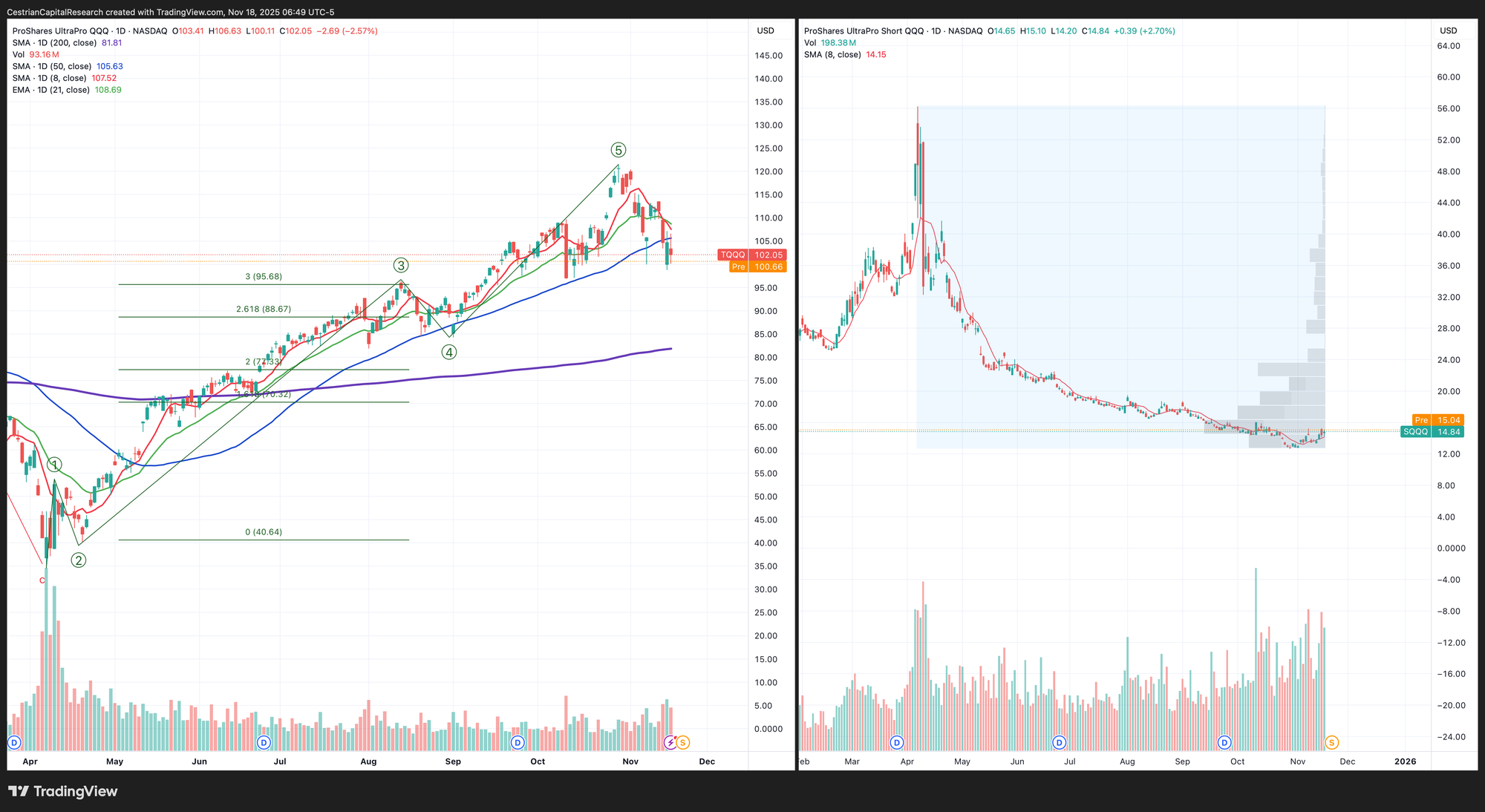 Disclosure: I am hedged 1:1 $TQQQ:$SQQQ, and have $TQQQ and $QQQ puts for December expiry. Overall (slightly) net short the Nasdaq.