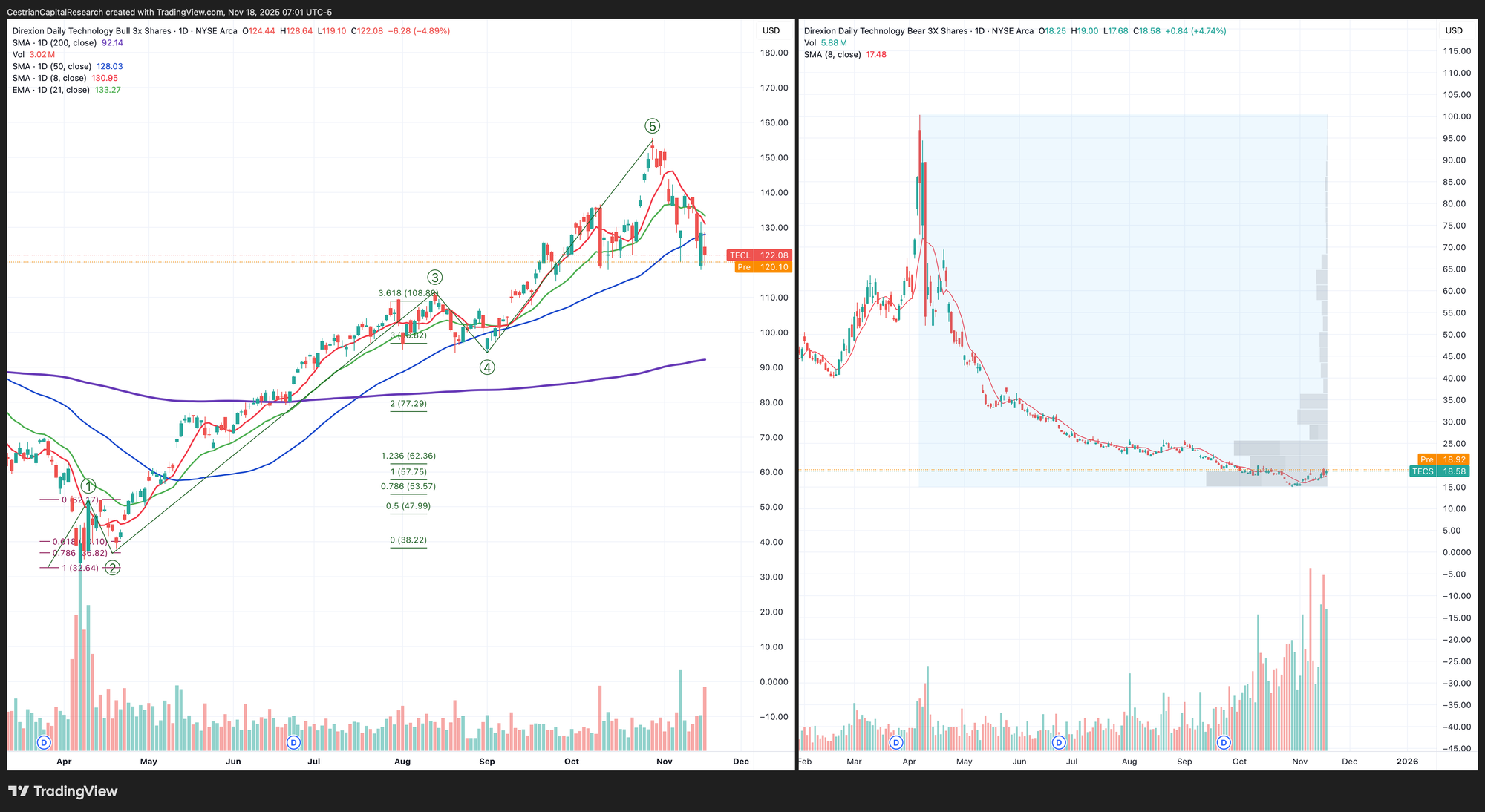 Note - TECL and its inverse TECS tend to be illiquid outside RTH with relatively wide bid/ask spreads.