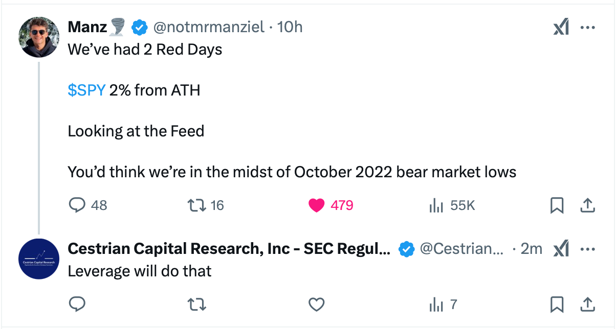 For now, as you will see below, we remain in a bull market. It may not feel like it if you are highly levered and unhedged long (as in, levered via the securities you hold - options, levered ETFs etc, or, levered via margin, or both). But most probably in my considered opinion, the next big move in stocks is up. Not necessarily today.