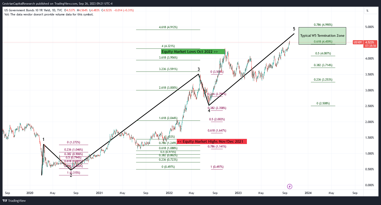 Per yesterday's 10-year yield chart - which is more or less the same as today's - 5% is probably the key level which if surpassed means that something else is afoot and one should be careful with long equities. We aren't there yet. So for now in staff personal accounts we are doing nothing as regards index positioning, just whiling away the time whilst the yield decides on its trajectory.