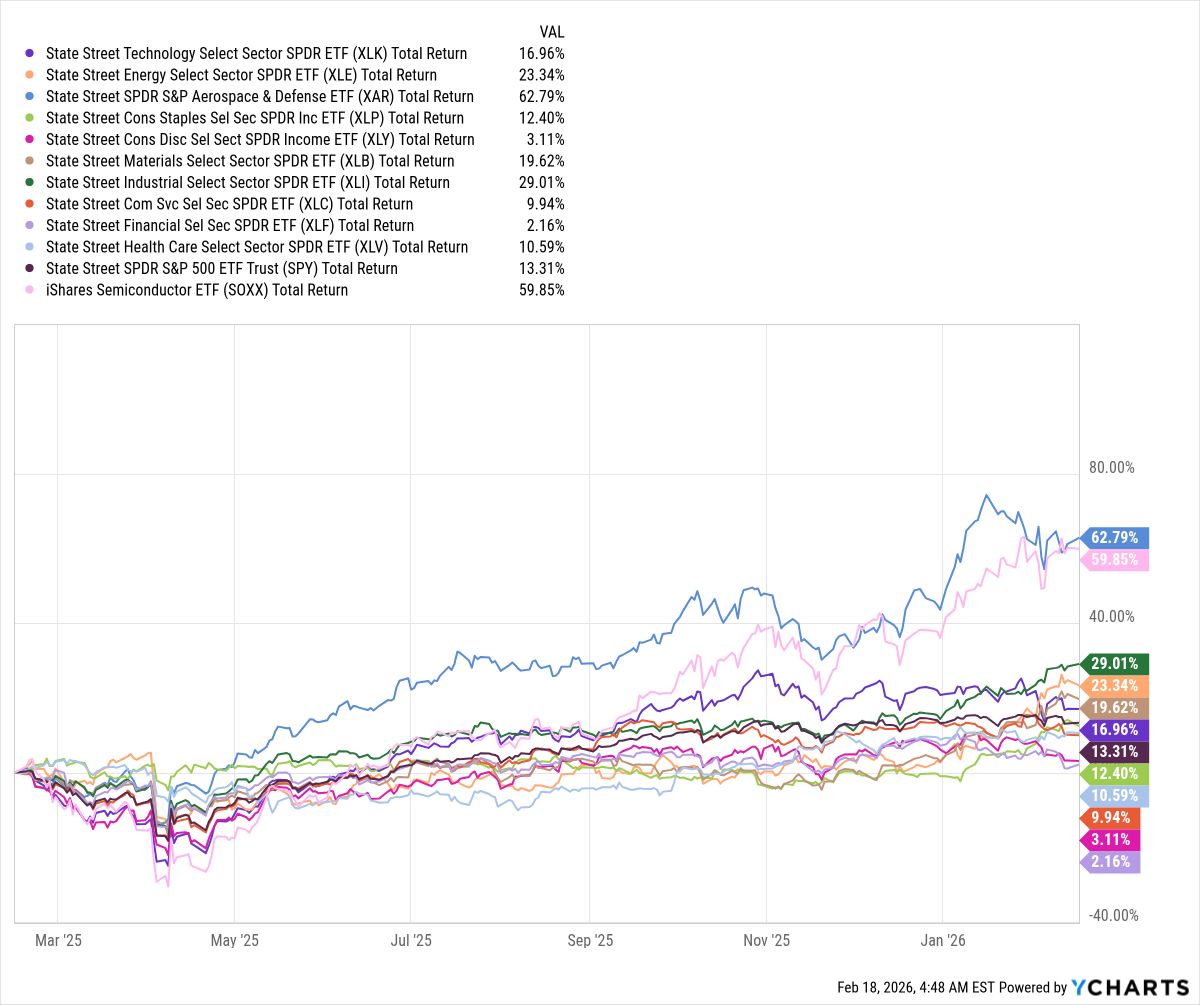 This is the last twelve months’ movements. Investors should have an eye on potential profit-taking in semiconductor and defense, and on rotation into consumer discretionary and financials. Yes I know. But that is how sector rotation works - “just when you least expect it, just what you least expect”.