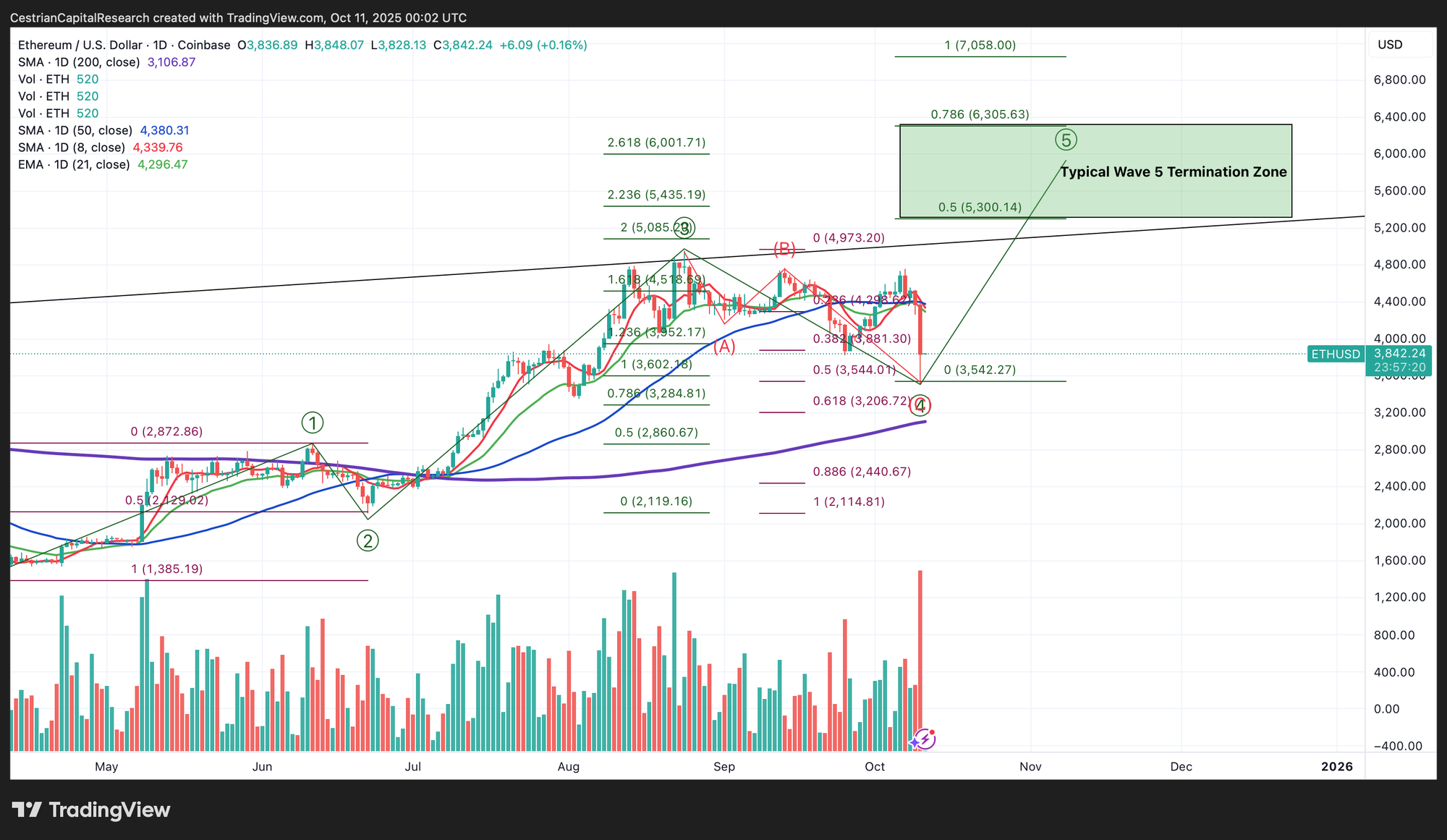 A classic rug pull in all of crypto today, and Ether was no exception. We reduce our Wave 5 target to 5300-6300 as a result. The chart still looks bullish.