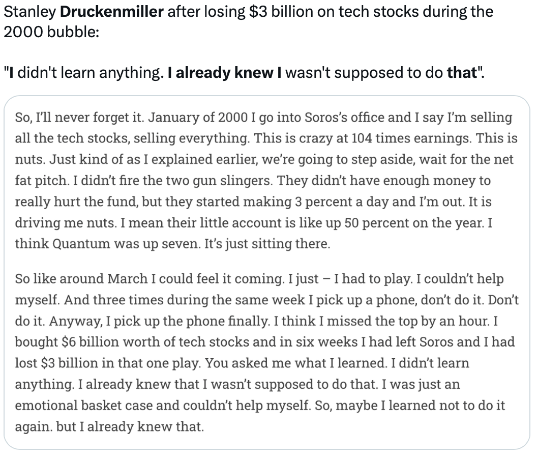 This is the power of your own limbic brain working against you. If you want to make money in securities markets, your first task is to recognize which ideas come from the twitchy, terrified, fighty little idiot in your brain stem, and which from the calm, sanguine, plays-the-long-game professional in your cortex.
