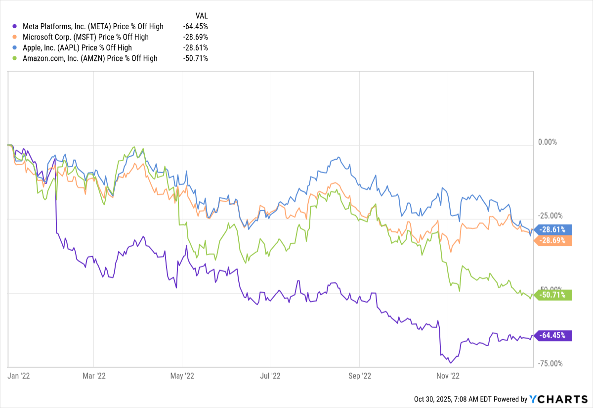 If you owned the grownup companies run by the old-line CEOs Nadella and Cook, you were down less than 30%, not bad for such a gruesome year in tech. Meta? A 75% drop at the lows. Jeez.