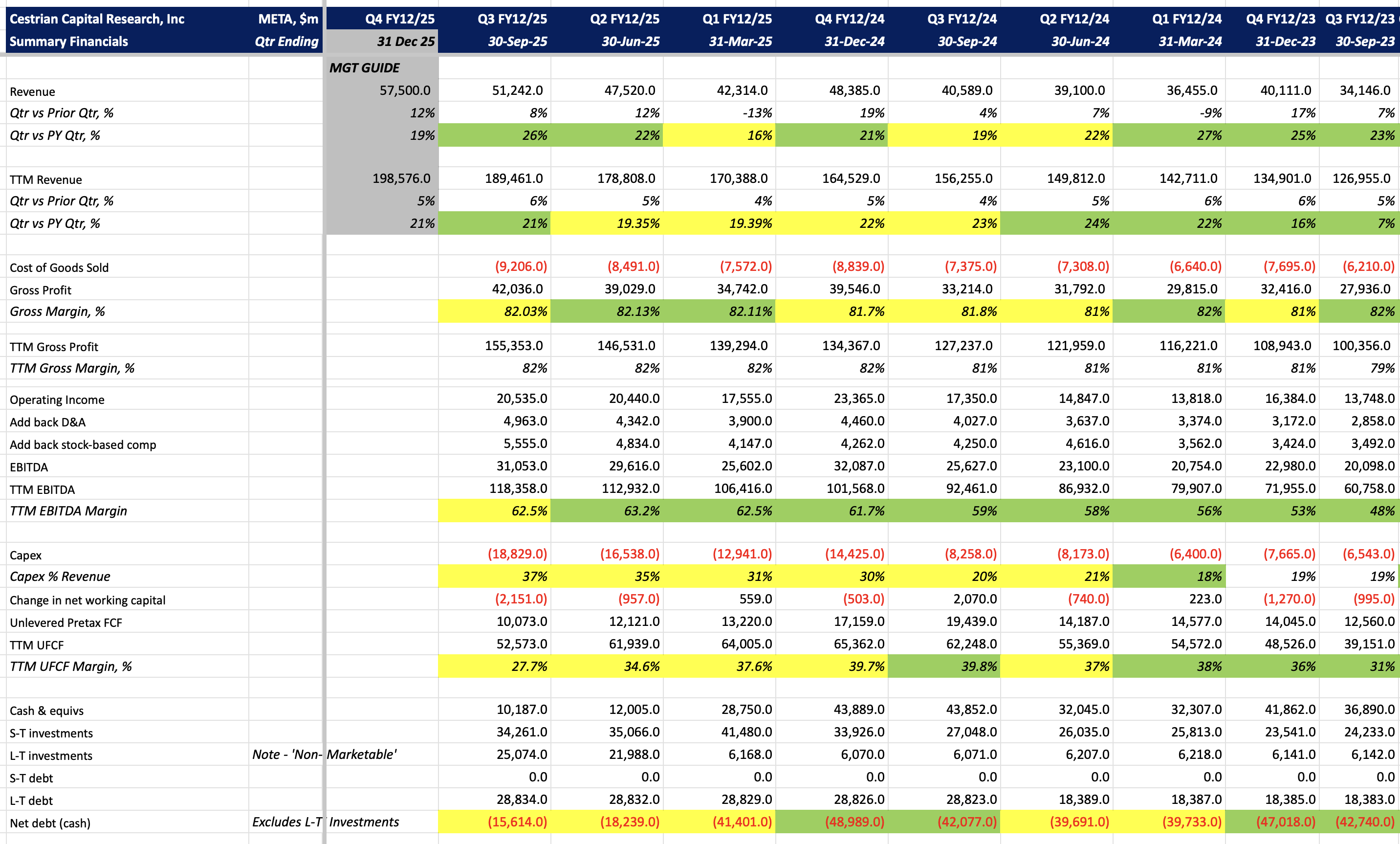 Mr. Zuckerberg is at it again, I feel. The capex bill is climbing, the balance sheet shrinking, and as yet there is no benefit to be seen in the rate of TTM revenue growth or EBITDA margins (which are before capex of course).