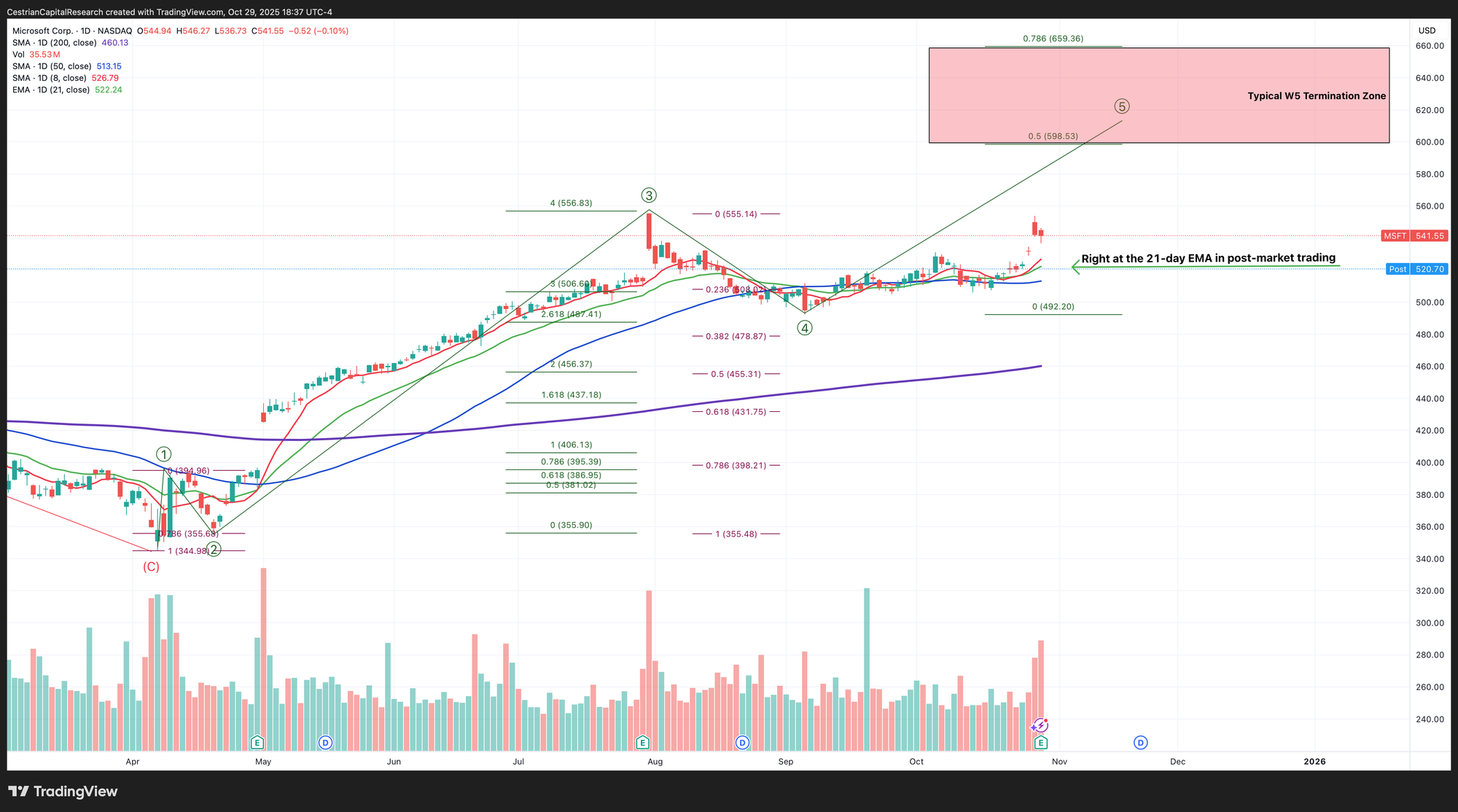The key level the stock has to hold tomorrow is $521, which is the 21-day EMA (green line). Below that and it can fall significantly further. Above that, bullish with a target between $598-659.