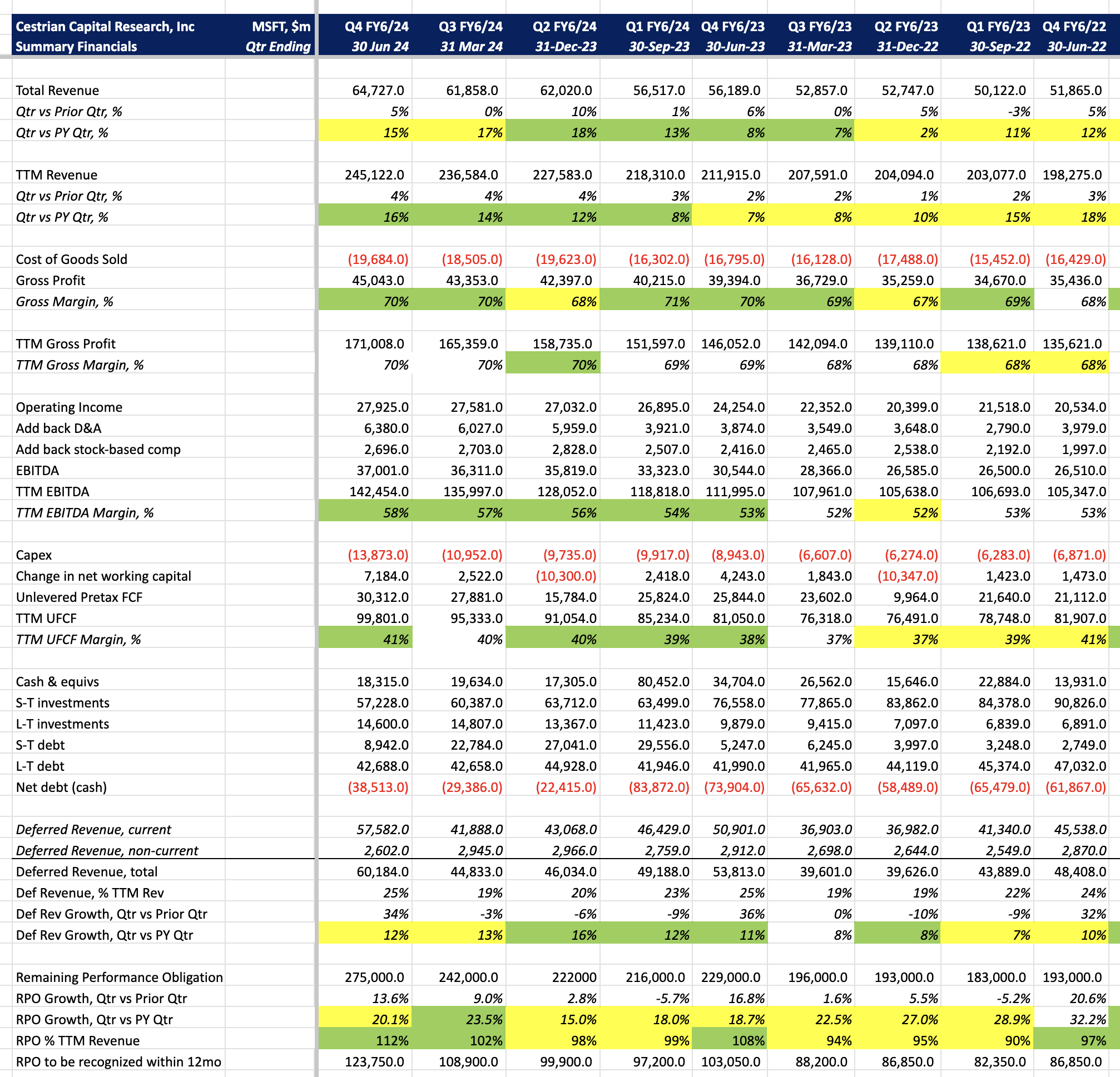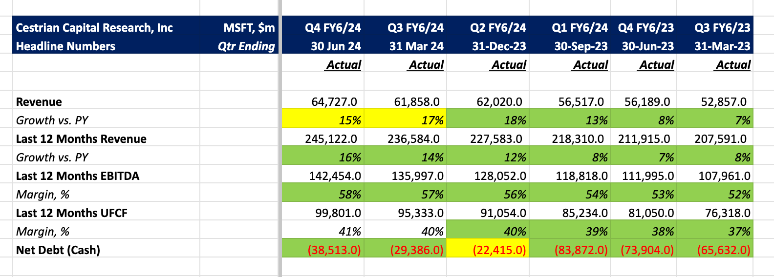Microsoft ($MSFT) reported its Q4 of its FY6/24 today after the close. The stock is off a little - around 6% at the time of writing (1645 Eastern) - but the print was good.
