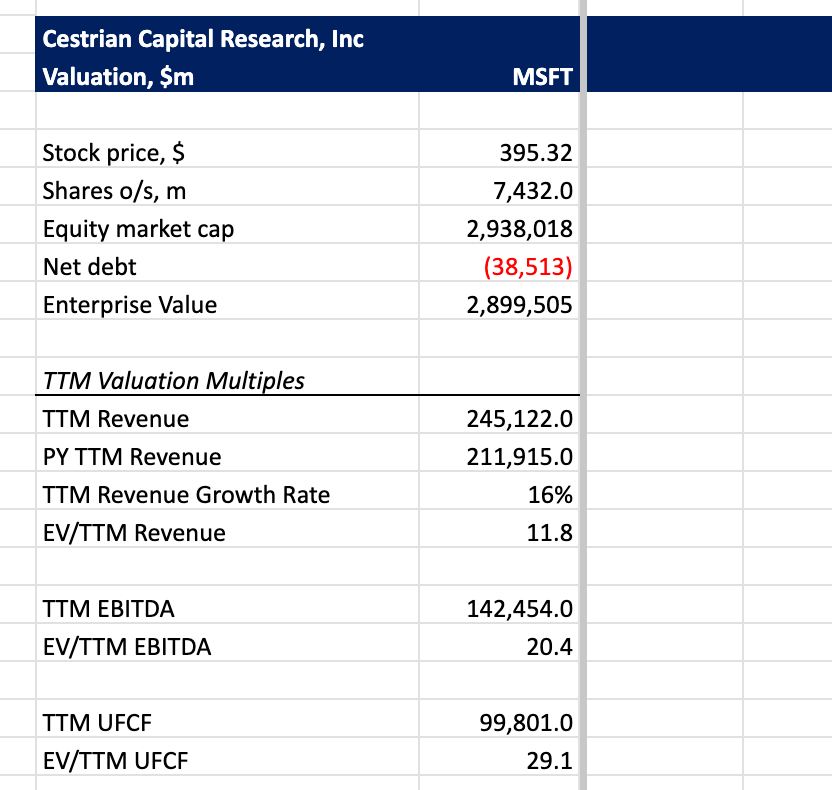 The quarter just printed was rock solid on fundamentals; the valuation is unchallenging, good value even in my view. There aren't that many companies in the world with 16% TTM revenue growth, 41% TTM unlevered pretax FCF margins, $39bn in the bank and with their stock available at just 29x TTM unlevered pretax FCF. You'll pay close to that for an ex-growth defense contractor, and before you say "but yield", check what you're actually getting in dividends from the defense community these days - it's not so different to what Seattle's finest will pay you.