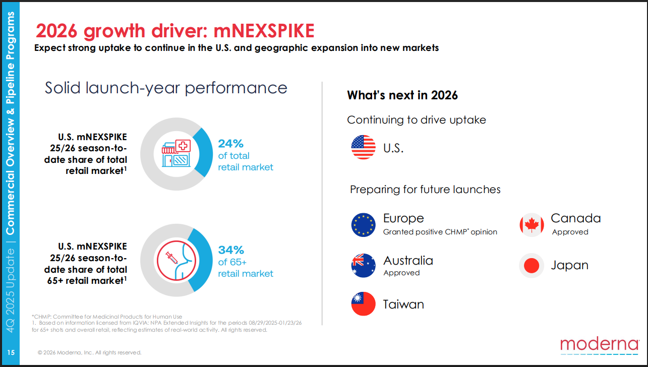At the same time, regulatory uncertainty has become a meaningful overhang. Shifting global vaccination recommendations, evolving strain-selection timelines, potential changes in U.S. public health policy, and heightened scrutiny on updated vaccine approvals should introduce significant variability in new product registrations. Upcoming programs will require regulatory alignment on immuno-bridging endpoints, correlates of protection, and post-marketing commitments. These will materially influence launch timing and commercial ramp of the Moderna pipeline.