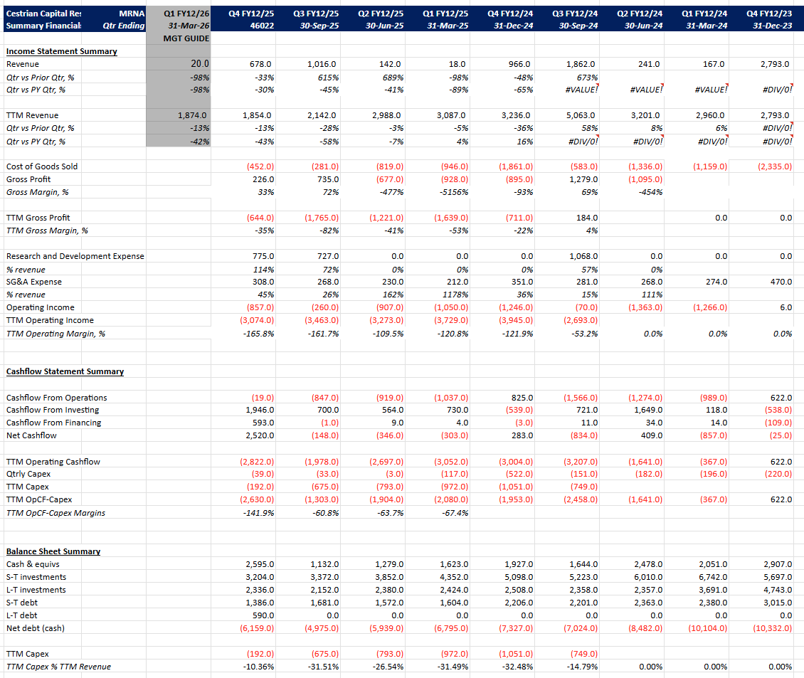 In my opinion, the biggest concern for Moderna right now is pipeline delivery due to regulatory uncertainty. The FDA’s refusal to file letter has put a big question on delivery timelines and post marketing commitments. Specifically, approvals in the US for Flu (mRNA-1010), Flu + Covid combination (mRNA-1083), and norovirus (mRNA-1403). What’s uncertain is how the changing FDA will view the Oncology portfolio (mRNA-4157 in collaboration with Merck) and what challenges may result from the negative perceptions around mRNA technology. Even though those programs remain on track and show promising data, I think the current regulatory environment is important to consider on the future valuation of Moderna.