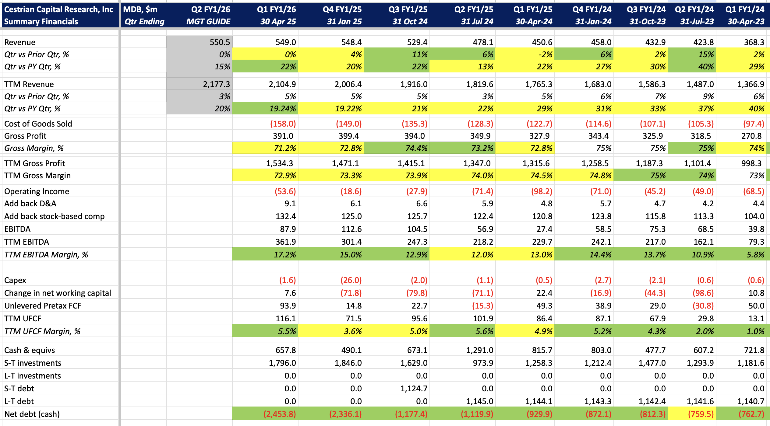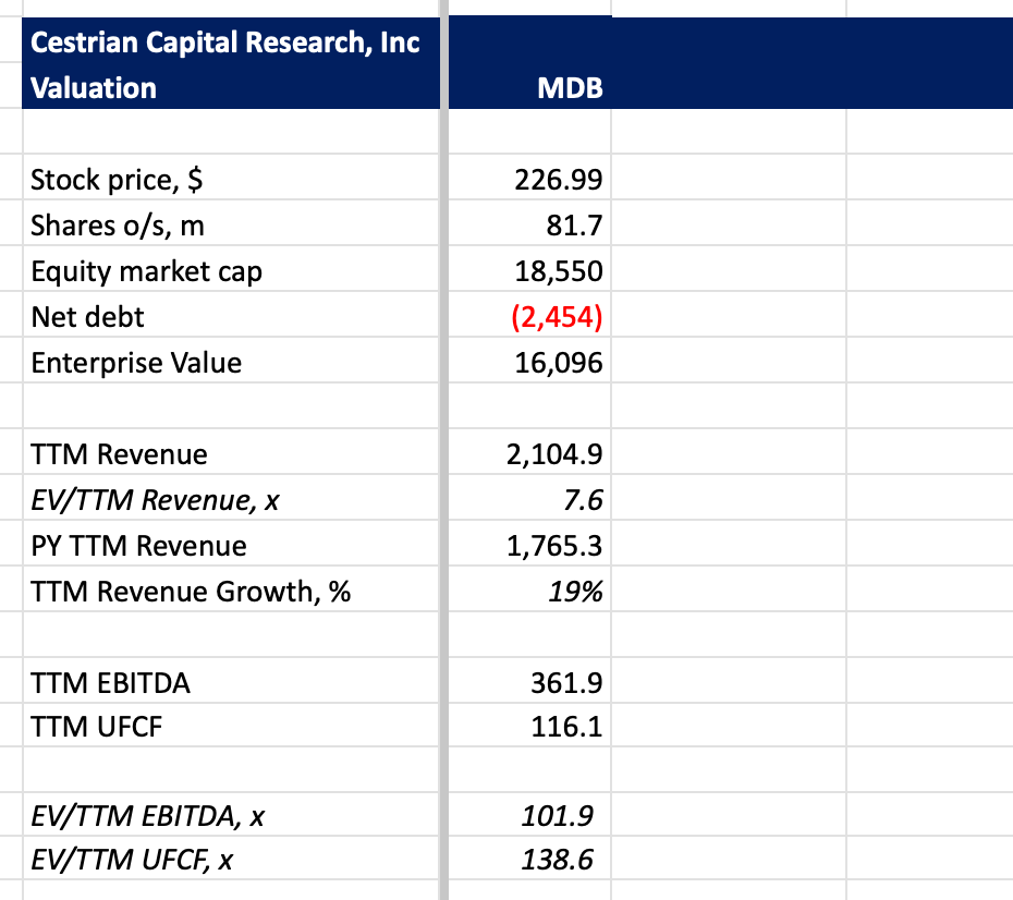 I think that MDB might, in time, be toast. Sixteen years after the commercial launch of the database product, the company has just $2bn of TTM revenue and is maybe the 5th largest database provider by revenue (source - Wikipedia). It has very little in the way of deferred revenue, so if it stopped selling new stuff tomorrow, the revenue line’s time-to-live would be a lot shorter than it should be if they had an Oracle-like revenue model. And it still only makes 5% cashflow margins despite growing at just 19% pa. This is not what good looks like. 19% growth, how about 20%+ cashflow margins. 5% margins, how about 30-40% growth. 5 and 19, not good.