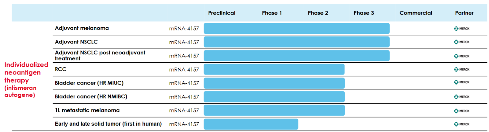 Probably the most important program in the pipeline, is mRNA-4157 which is currently being co-developed with Merck. Phase 2b showed that “the combination of mRNA-4157 and pembrolizumab (Keytruda) demonstrated a durable and meaningful improvement in recurrence-free survival (RFS) and distant metastasis-free survival (DMFS) in patients with high-risk, resected melanoma compared to pembrolizumab alone.” Currently there are 8 ongoing clinical studies in collaboration with Merck.