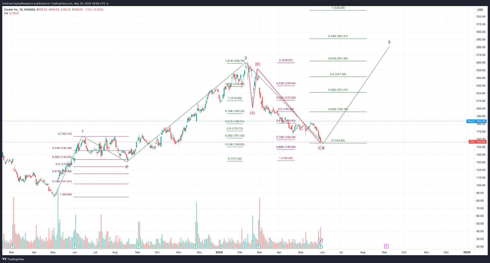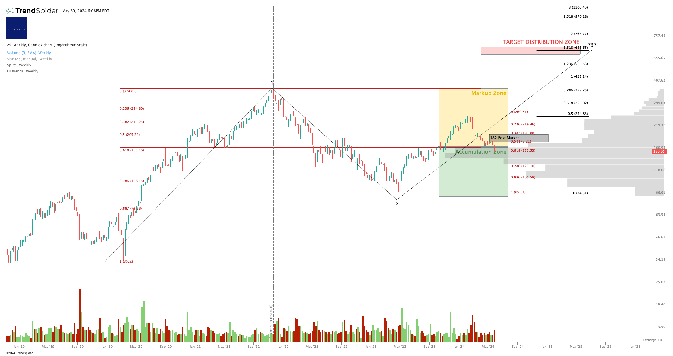 Which I don't mind saying is a bit flaky, because the Wave (4) shown broke the Wave (1) high which technically means this chart is, er, wrong. But we'll stick with it for now. If ZS dumps during market hours tomorrow, we have to re-visit the chart.