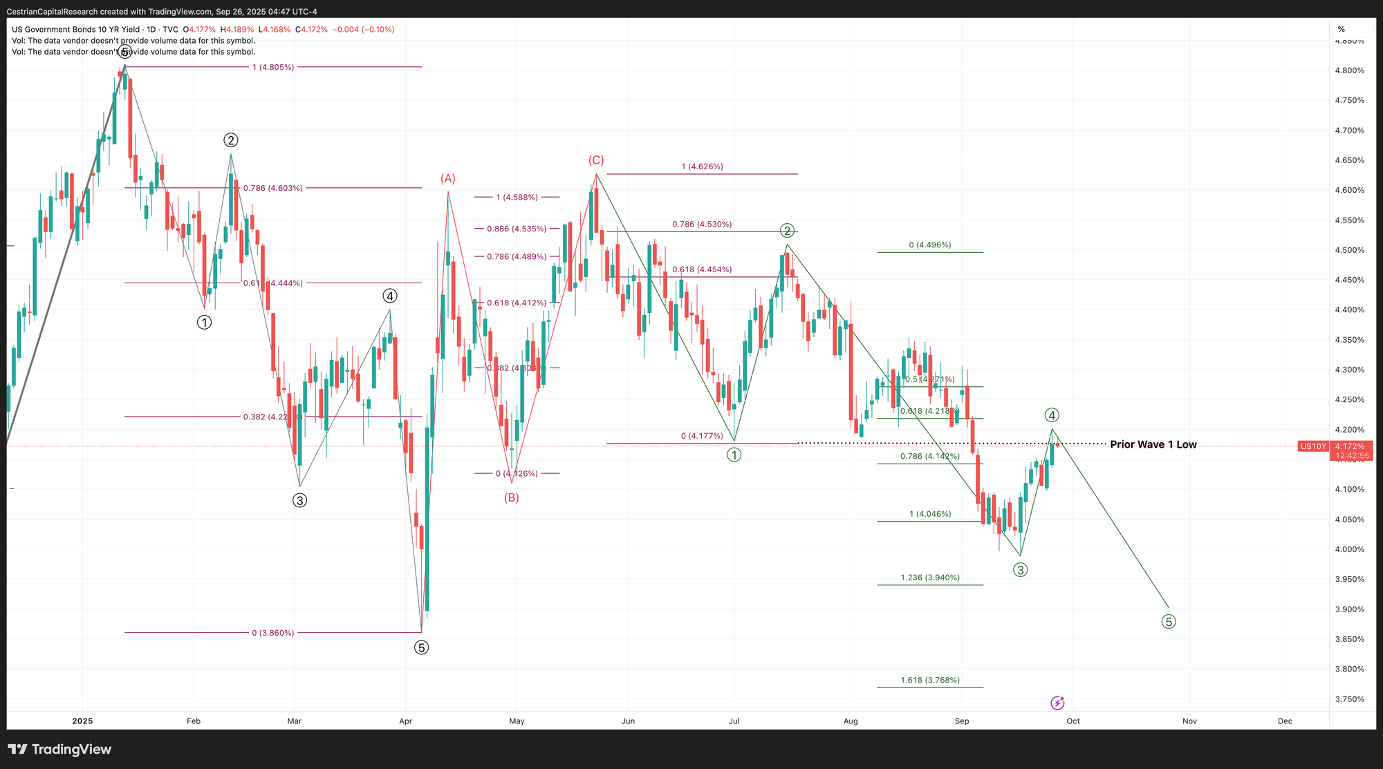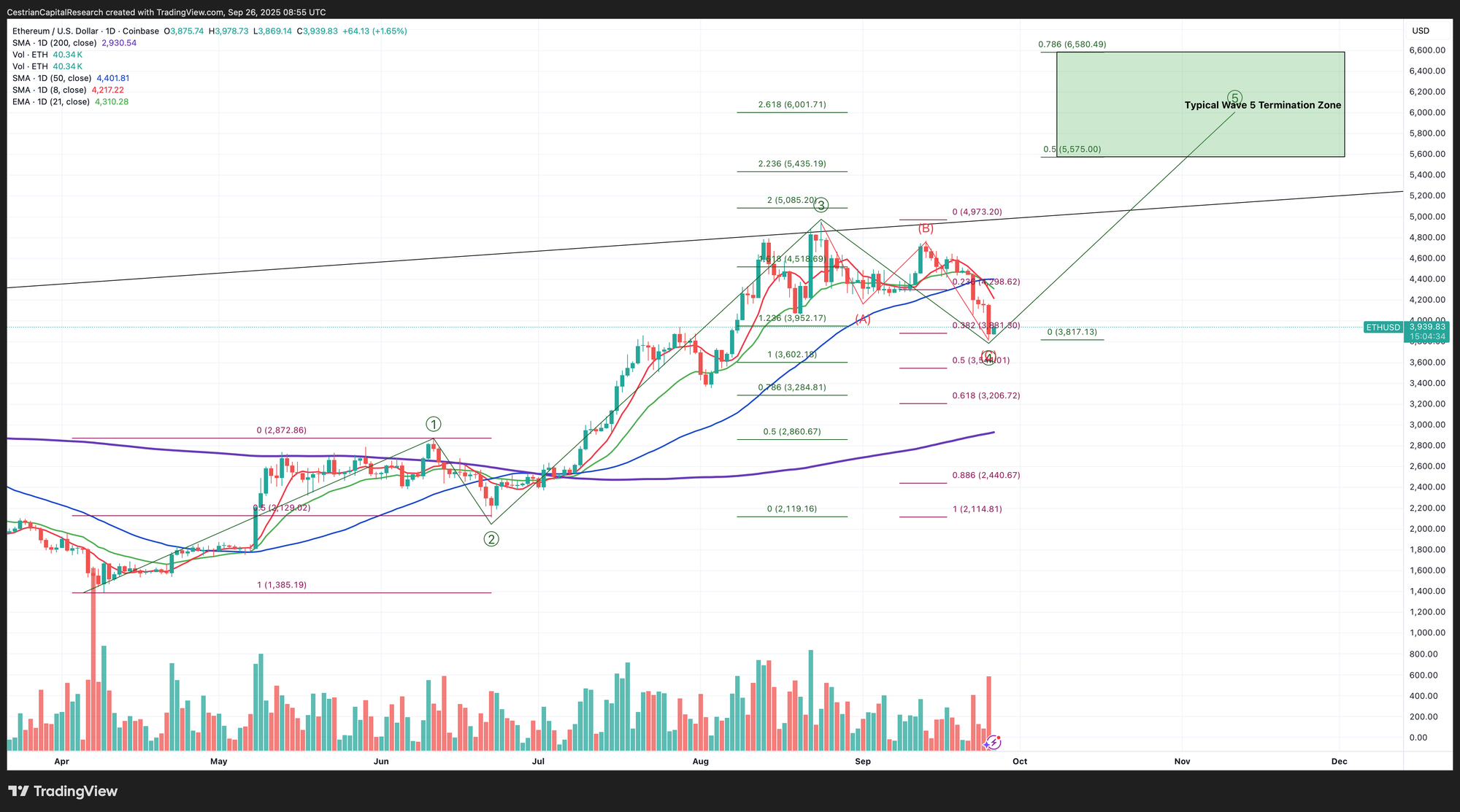 Ether has a little work to do. Leveraged native Ether traders on the long side were blown out in recent days; to be bullish, Ether has to start to reclaim some of those short-term moving averages. Given the continuous bid from the treasury companies (Bitmine Immersion, SharpLink et al) I remain positive on Ether myself. Wave 5 target dragged down a little to reflect the lower Wave 4 so far.