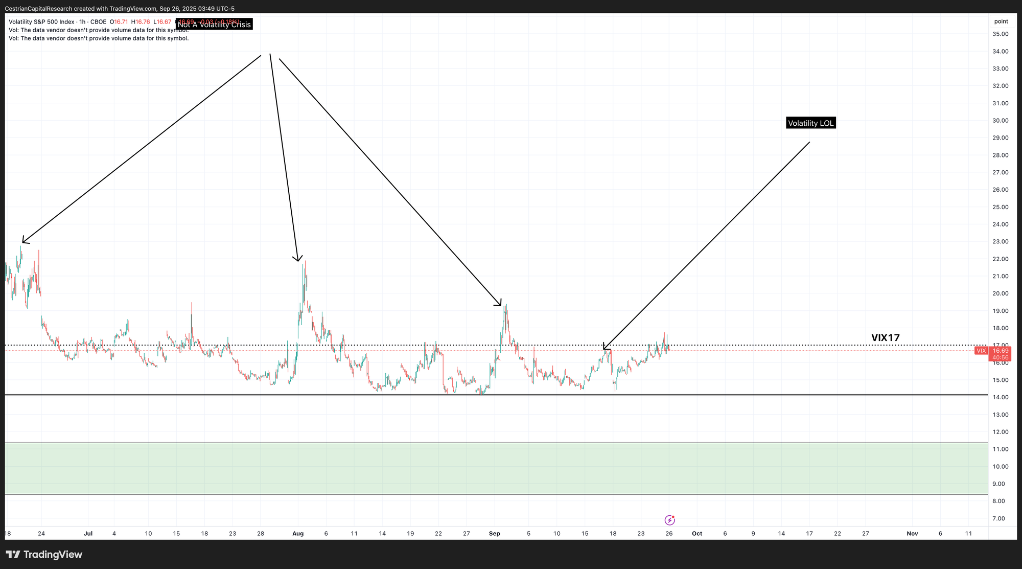 Zooming in - Vix is below 17, which seems an important level. Up and over 17 and turning 17 into support, we likely have some equity bearishness ahead.