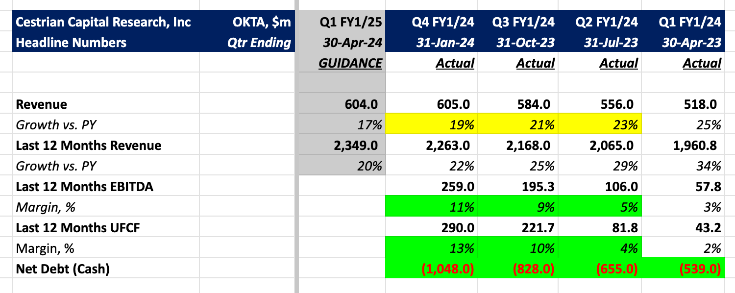 This quarter Okta looks to have grown up. The financials present as a well run software company which is maturing - growth is slowing - but doing so gracefully - margins are rising and so is the pile of net cash on the balance sheet. Someone has had a let's-call-it-kindly arm around the CEO's shoulders explaining how things need to be.