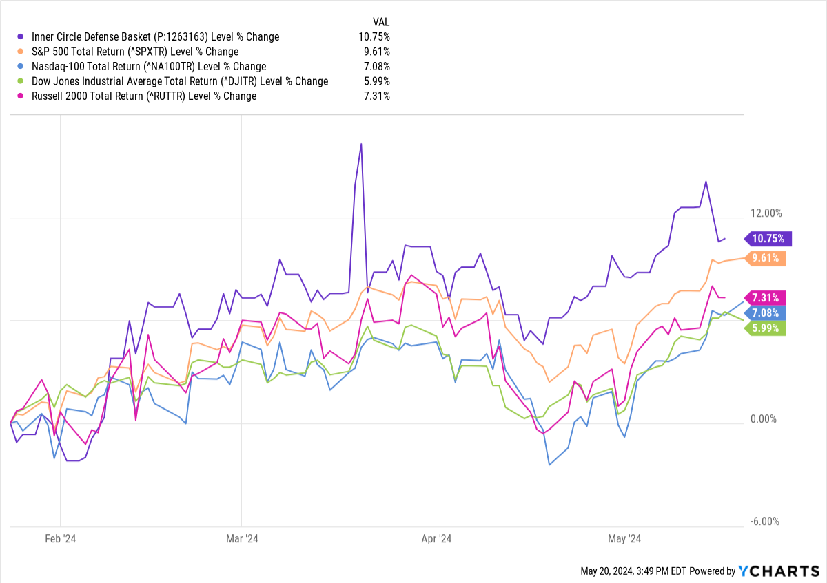 The Wyckoff Rotation method we overlay on our technical and fundamental analysis has proven very useful in following bigs around. Here, for instance is our Inner Circle Defense Sector Model Portfolio, vs. the S&P500, Nasdaq-100, Dow Jones 30 and Russell 2000, since inception in January this year.