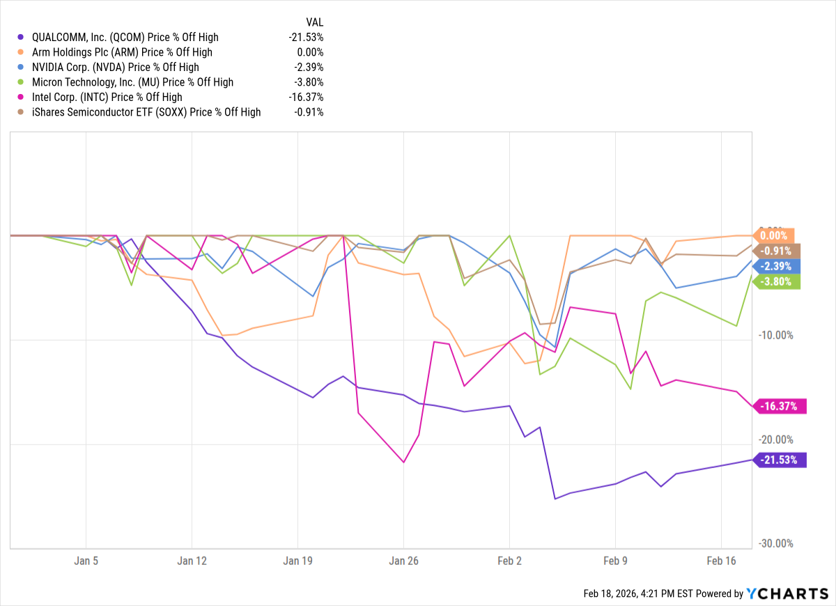 No-one loves Qualcomm anymore, as is obvious from this chart. It’s a % off highs chart, year to date, showing the sector ETF SOXX plus a handful of sector names. Qualcomm’s name? Mud. -22% YTD. Ew.
