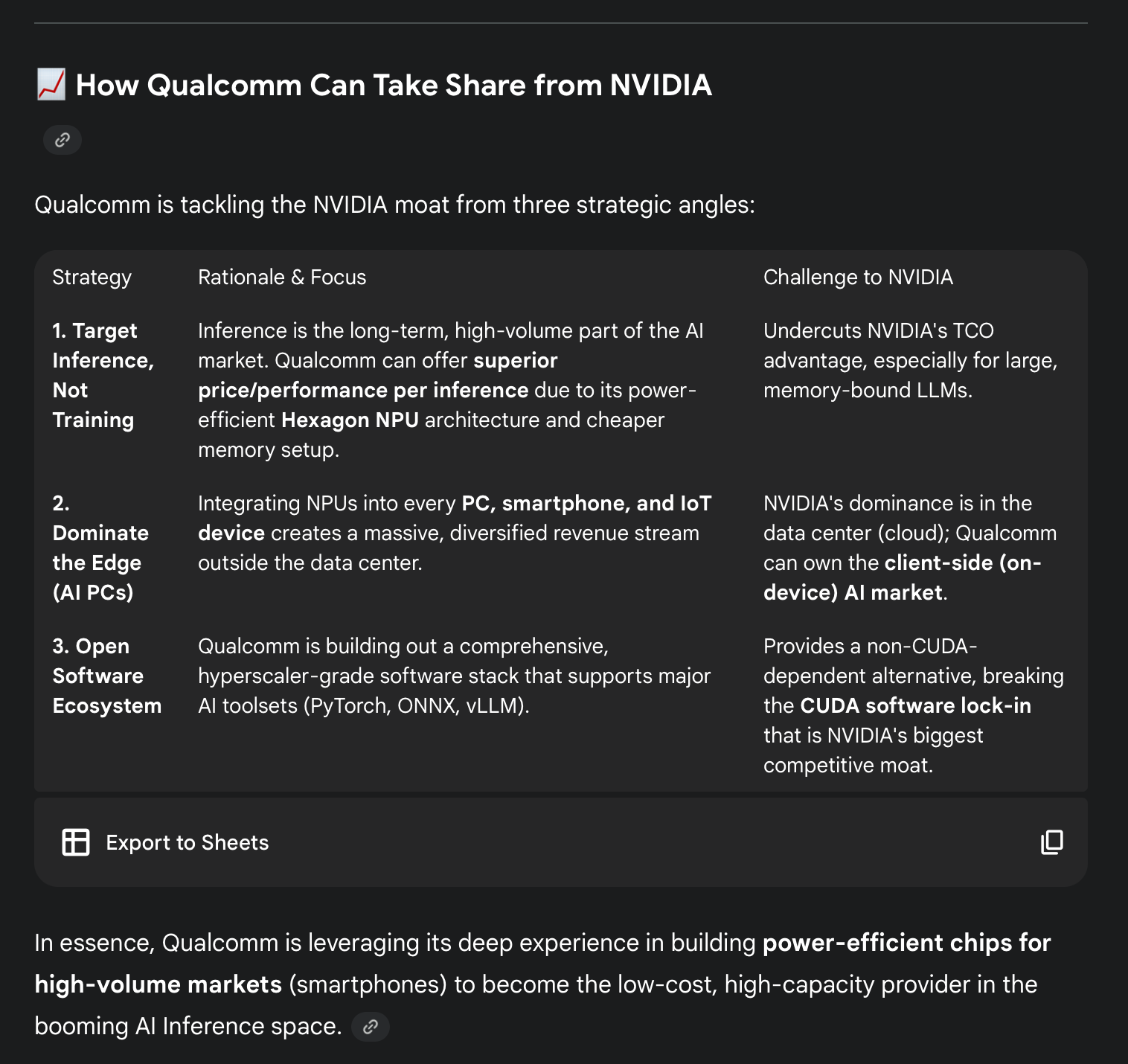 Qualcomm, I think, has a shot at sustaining its growth in the coming years; the key dependency in my mind is whether capital continues to be available for AI datacenter buildout. The company is one of a handful of chip vendors that may succeed in dislodging NVDA’s monopoly. You know that customers are looking for NVDA alternatives, because no-one likes all that winning and in particular no-one likes being beholden on price and volume to one vendor. And you know that if 2-3 trusted suppliers pop up with alternatives to the NVDA GPU paradigm, customers will happily go that way. To me the most likely candidates to benefit from customer desire to cut costs (by which I mean total cost of ownership, including the power bill) are $AVGO, $ARM, $AMD, $QCOM and maybe $INTC.