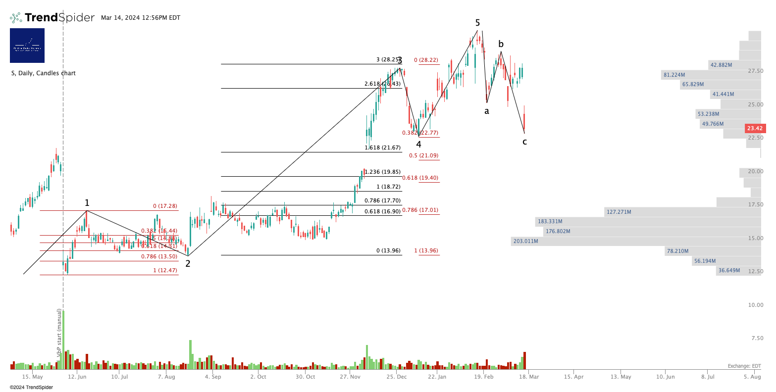 The stock is trending upwards too, not that you would know it from the post-earnings dump today. In truth though, the name is just in the throes of an a-b-c correction after a big 5-wave move up from the 2023 lows. You can open a full page version of this chart, here.