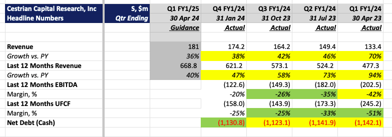 SentinelOne ($S) is a cybersecurity business, endpoint focused, competes head on with CrowdStrike ($CRWD) albeit at a lower price point and typically with slightly less sophisticated target customers. The company is doing fine - growth is good, cashflow margins still weak but getting steadily less bad, balance sheet has multiple years’ worth of cash on hand even at the current burn rate, all fine.