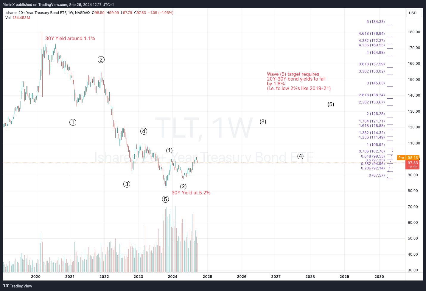 I think there is every chance we may get a much steeper market pricing for rate cuts in this cycle. Perhaps not tomorrow, or next month, but early or mid-2025. The longer end yield can get all the way down to low 2% like it did in 2019. This would be bullish for TLT, which can get all the way up to $130 in the medium term.