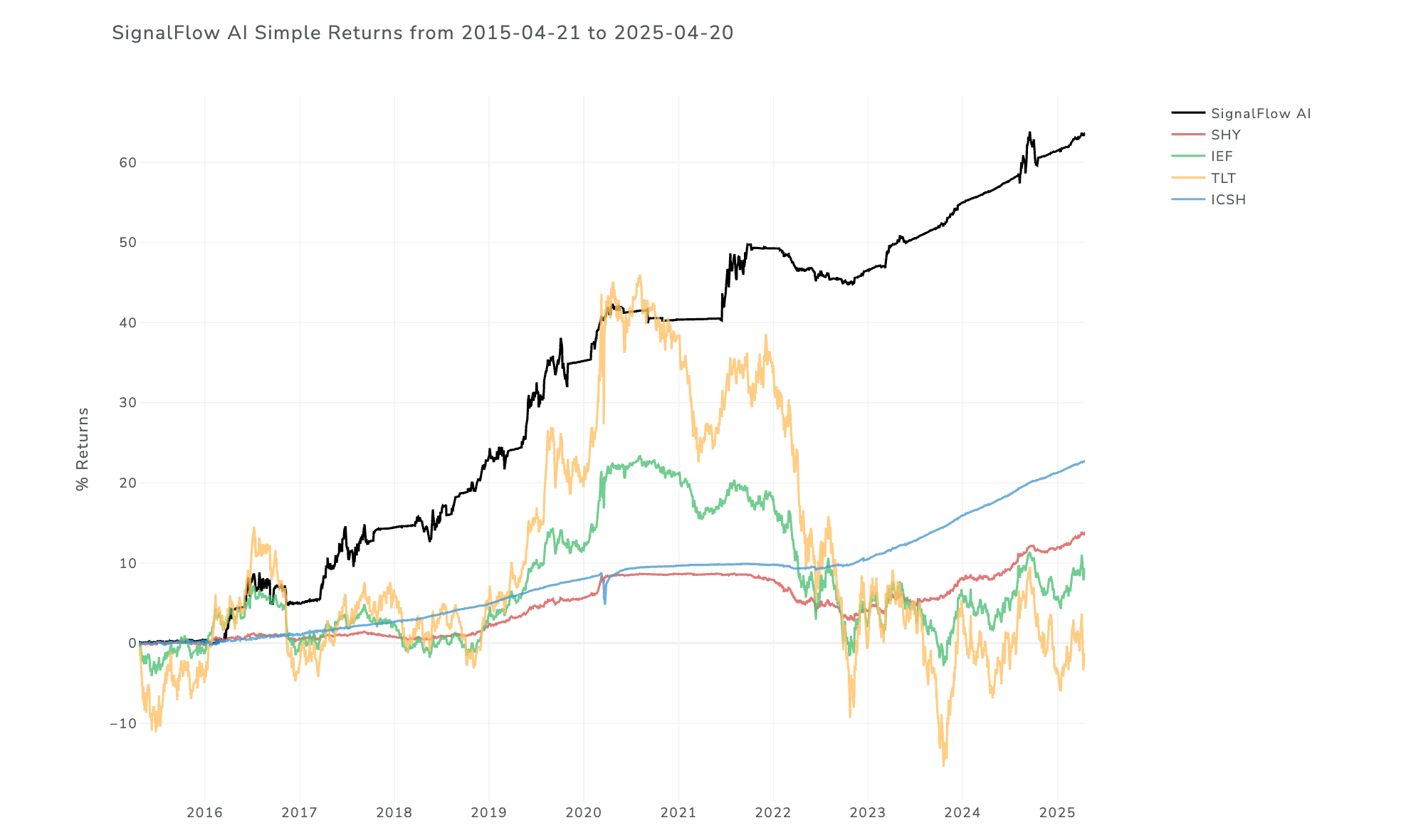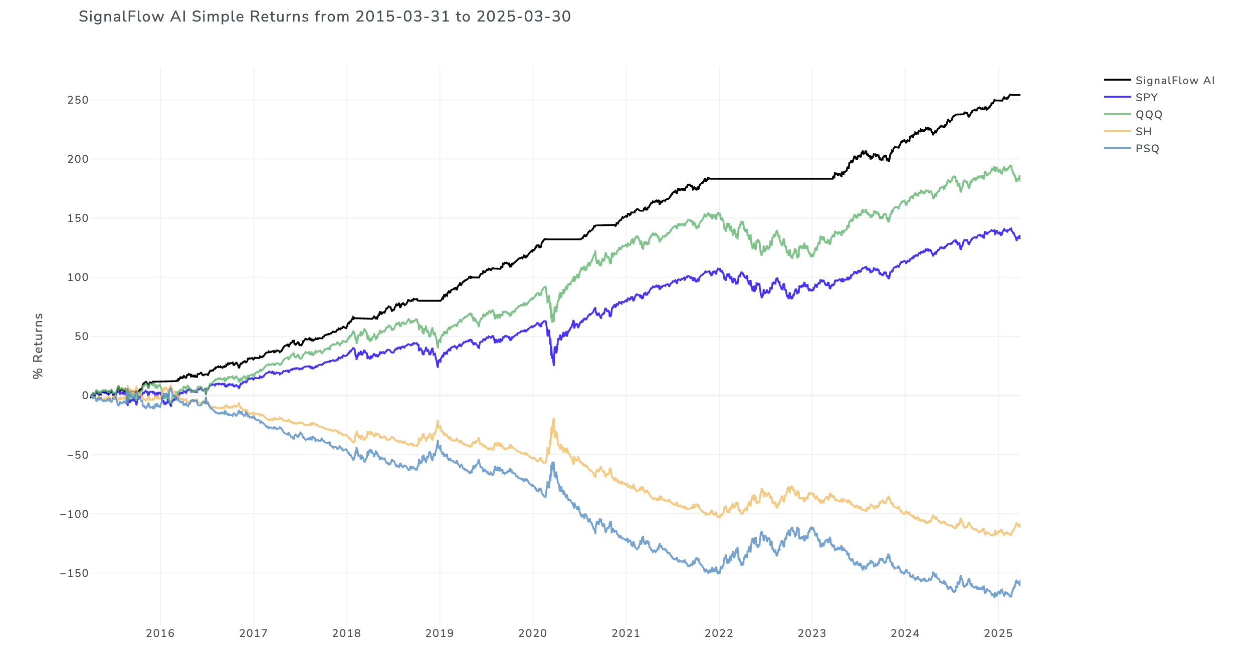 SignalFlow AI Long/Short provides a signal service, once daily at the close, stating which of the following ETFs the model believes is the most compelling to own: