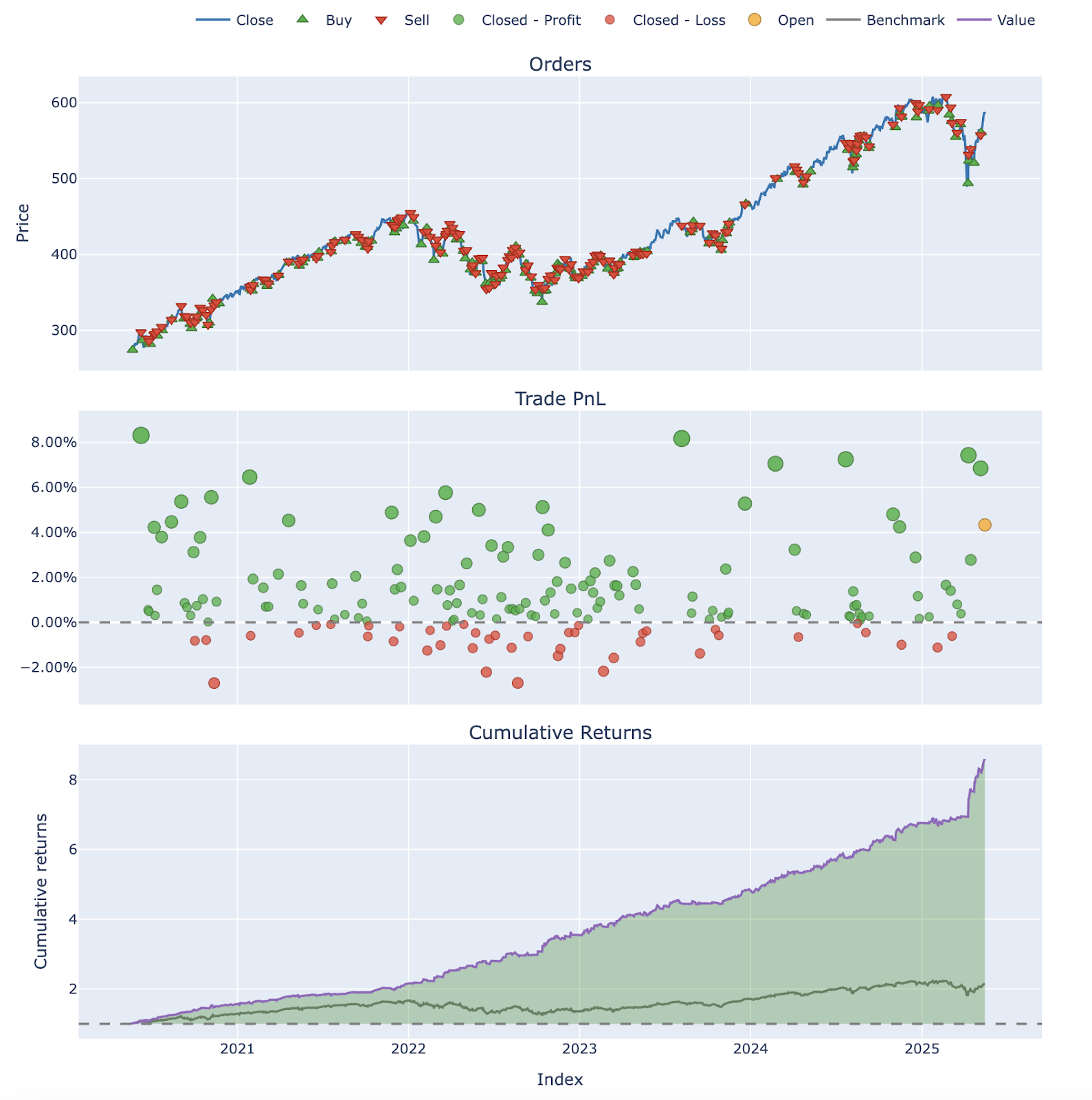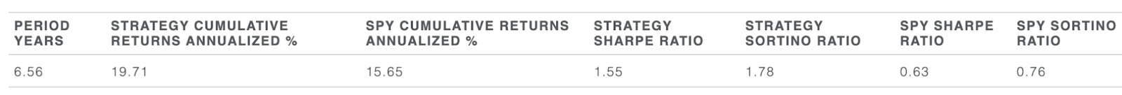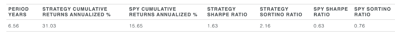 Not only does the SignalFlow strategy outperform SPY buy and hold, it significantly improves return on risk measurements such as the Sharpe and Sortino ratios.