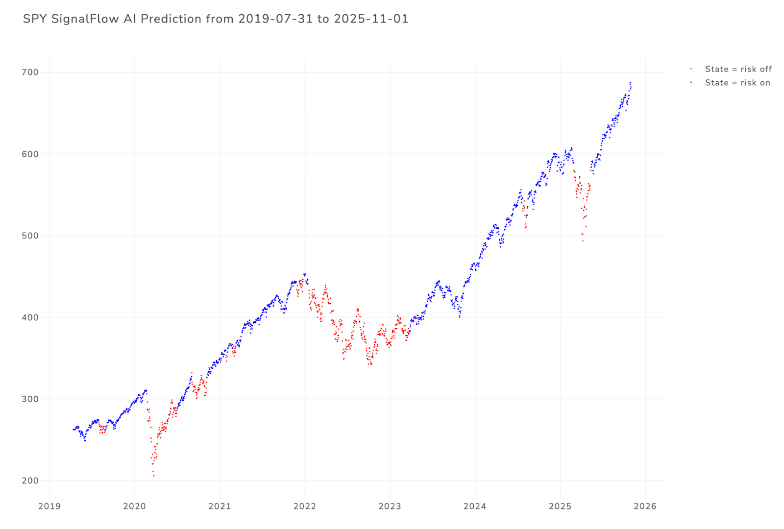 - SignalFlow AI For $SPY provides a simple S&P500 ‘Risk On’ / ‘Risk Off’ signal daily at the close. A ‘Risk On’ signal means the model believes the S&P500 is not at risk of a material selloff; the implication being that the $SPY ETF can be bought or held. A ‘Risk Off’ signal means the model believes the S&P500 is at risk of a material selloff; the implication being that it believes owning cash is preferable to owning $SPY.