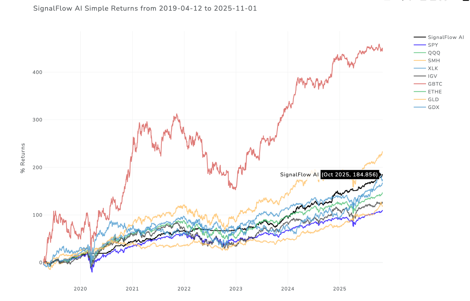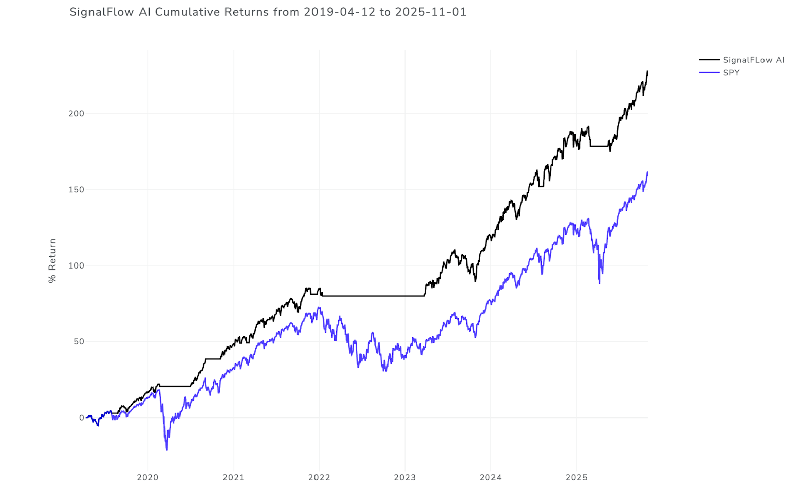 To capture this insight, we developed SignalFlow AI, a machine-learning AI model that identifies risk-on and risk-off states for markets, ETFs, and stocks. Note how SignalFlow avoids dramatic downturns.
