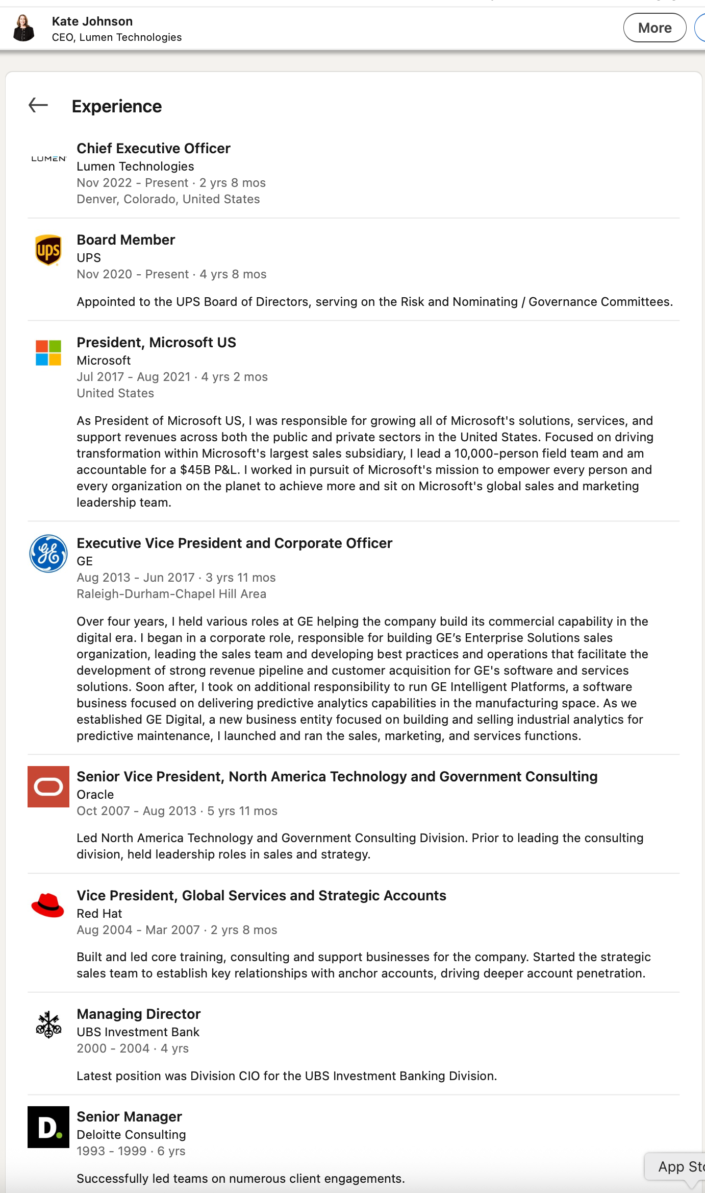 I've never met Kate Johnson so I can’t vouch for her managerial skill personally. But I can say that Oracle, GE and Microsoft are tough old places to work. Oracle in particular has a reputation for eating the weak.