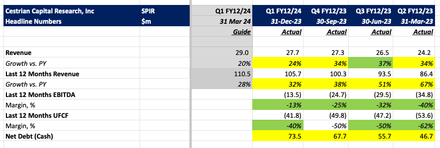 $SPIR reported its Q4 of FY12/23 yesterday after the close. It was a good quarter. A slight miss on revenue vs. their guide; personally I can live with that, small companies are less predictable than large companies and the revenue line is always going to wobble around some. As long as it is trending up at a decent pace, that’s OK in my book. The company clocked up a very important milestone, which is to say positive EBITDA this quarter. EBITDA is not a thing, really; it’s not cashflow (the company was still cashflow negative this quarter), it’s just an accounting measure and one which is extraordinarily pro-management-friendly, particularly in companies with a degree of capex intensity which of course is the case here. But it is a milestone of sorts for previously heavily-lossmaking companies to turn EBITDA positive, because it indicates that positive cashflow generation may not be too far away. And to be cashflow positive at this scale is quite a feat. Spire isn’t there yet, but the management team seem committed to get there. That’s not as common as you might think; it’s a big plus as far as management team mindset goes. (It’s often the case that microcap management teams think cashflow is something they get from shareholders).