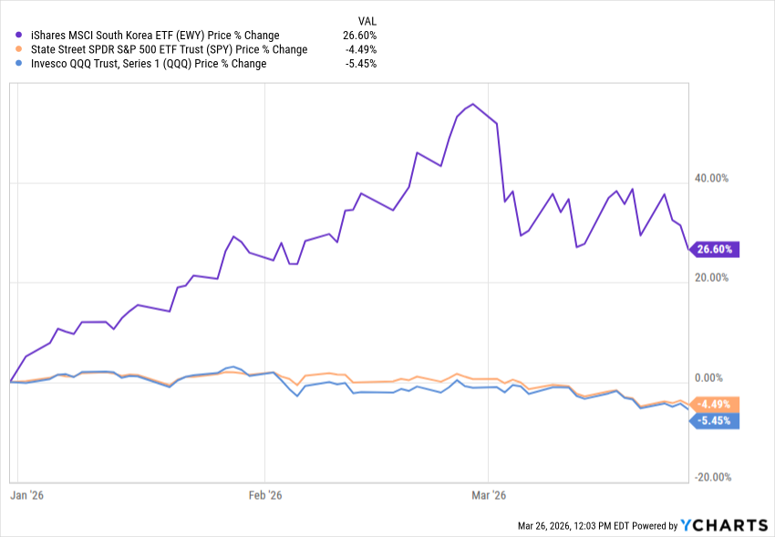 Of course, there are plenty of non-US equities in which to invest or trade. The South Korean index has been absolutely on fire for a while now, propelled by (i) rising earnings in SK Hynix and Samsung, two of the three memory companies that matter and also (ii) a frenzy in margin-loan driven retail buying. Even after some cooling off, $EWY remains +26% YTD vs. -4.5% for the $SPY and -5.55% for the $QQQ.