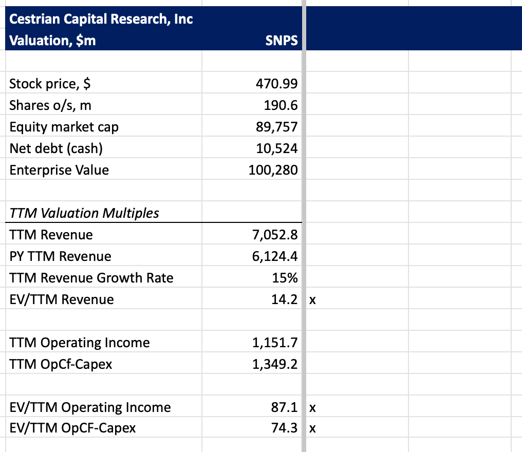 These are the headline multiples but honestly with the large-scale acquisitions (of Ansys) and divestments (of a software division) then you can either spend 16 hours attempting to pro-forma the TTM numbers for what you in your own mind believe would have existed if the business had been in its current form for twelve months, or you can just watch the net debt and the stock chart. Personally I choose life.