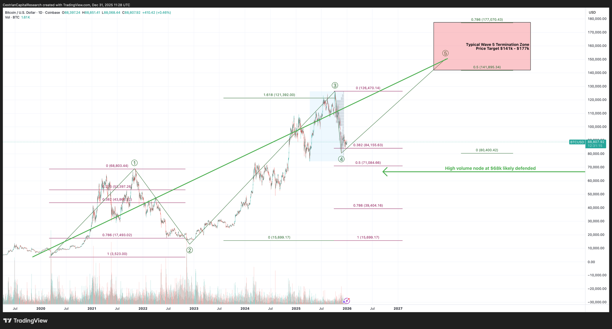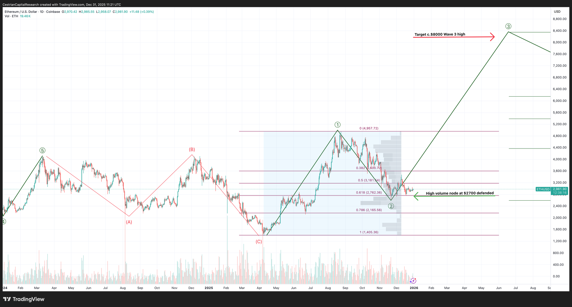 Target $8000, which is a little below the 1.618 Wave 3 extension high.