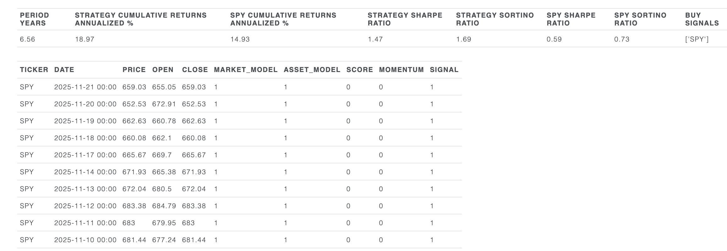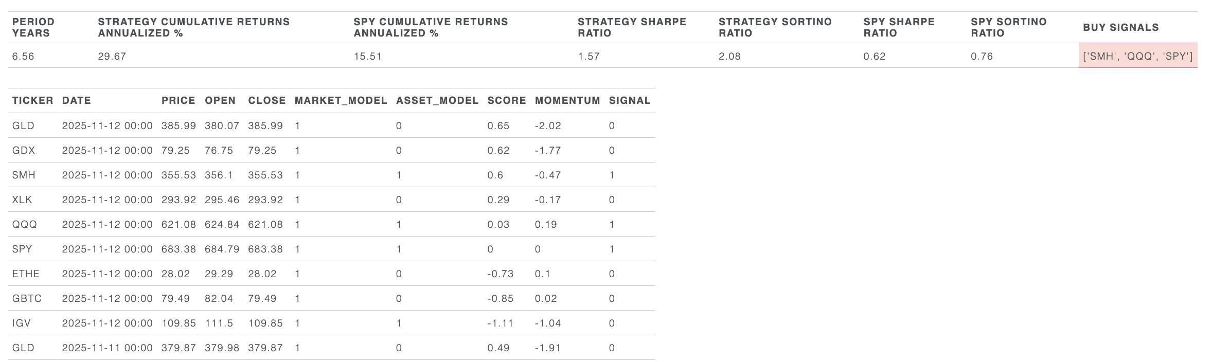 This is a sector rotation model designed to accelerate returns vs. the S&P500 when the model believes the S&P is in a “risk-on” state. The model selects from a list of sector ETFs and, again, prints a signal just after the New York close each day with the expectation that the consequent trades are placed at the following New York open.