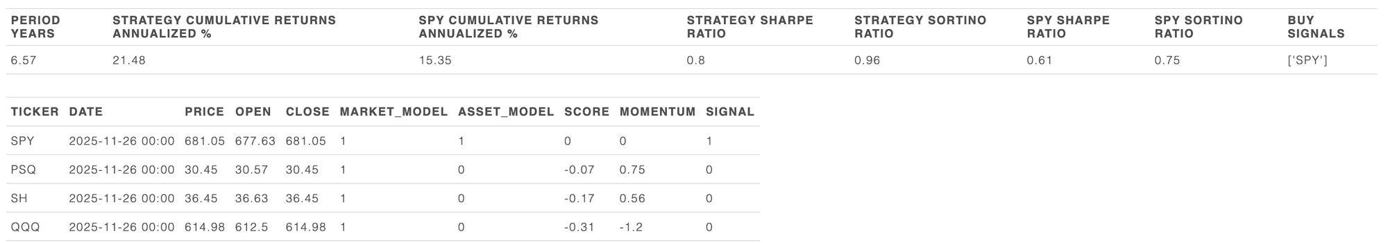 The goal of this model is to provide market-neutral investing. This strategy is intended to deliver positive returns whether the market is going up or down. The model chooses between long SPY, long QQQ, cash, long SH (1x short SPY) and long PSQ (1x short QQQ) ETFs. As with all the SignalFlow models it prints a signal once per day, just after the close, and it assumes the relevant trade is placed at the following New York open.