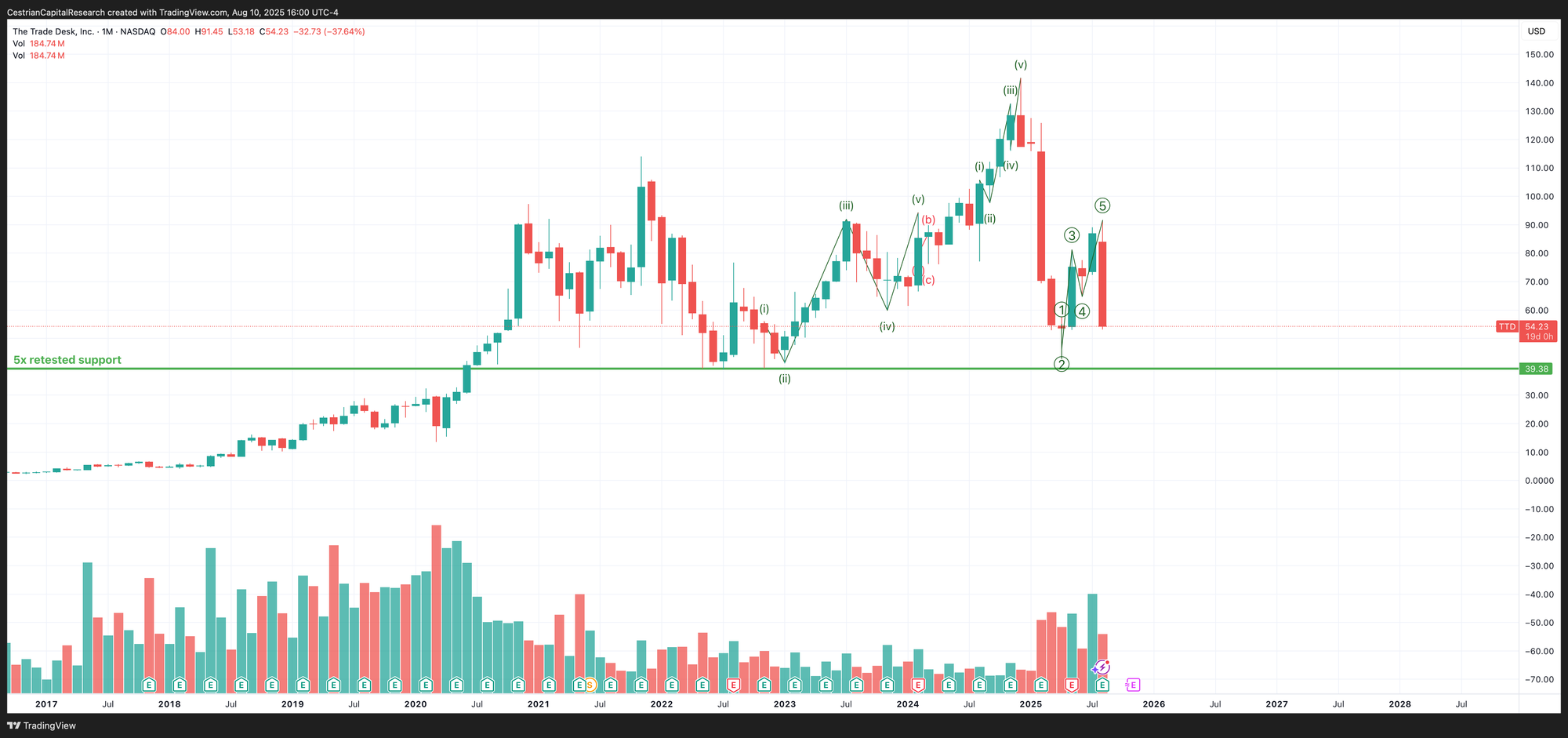 Long-run support for $TTD stock sits in the $40 zip code.