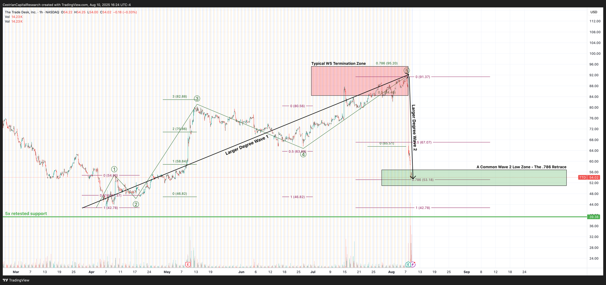 I don’t think TTD will magically reach for the stars tomorrow, but I do think it will start to put in an accumulation pattern down here at the lows. If so we may see a new Wave 3 up on this timeframe (months) before too long.