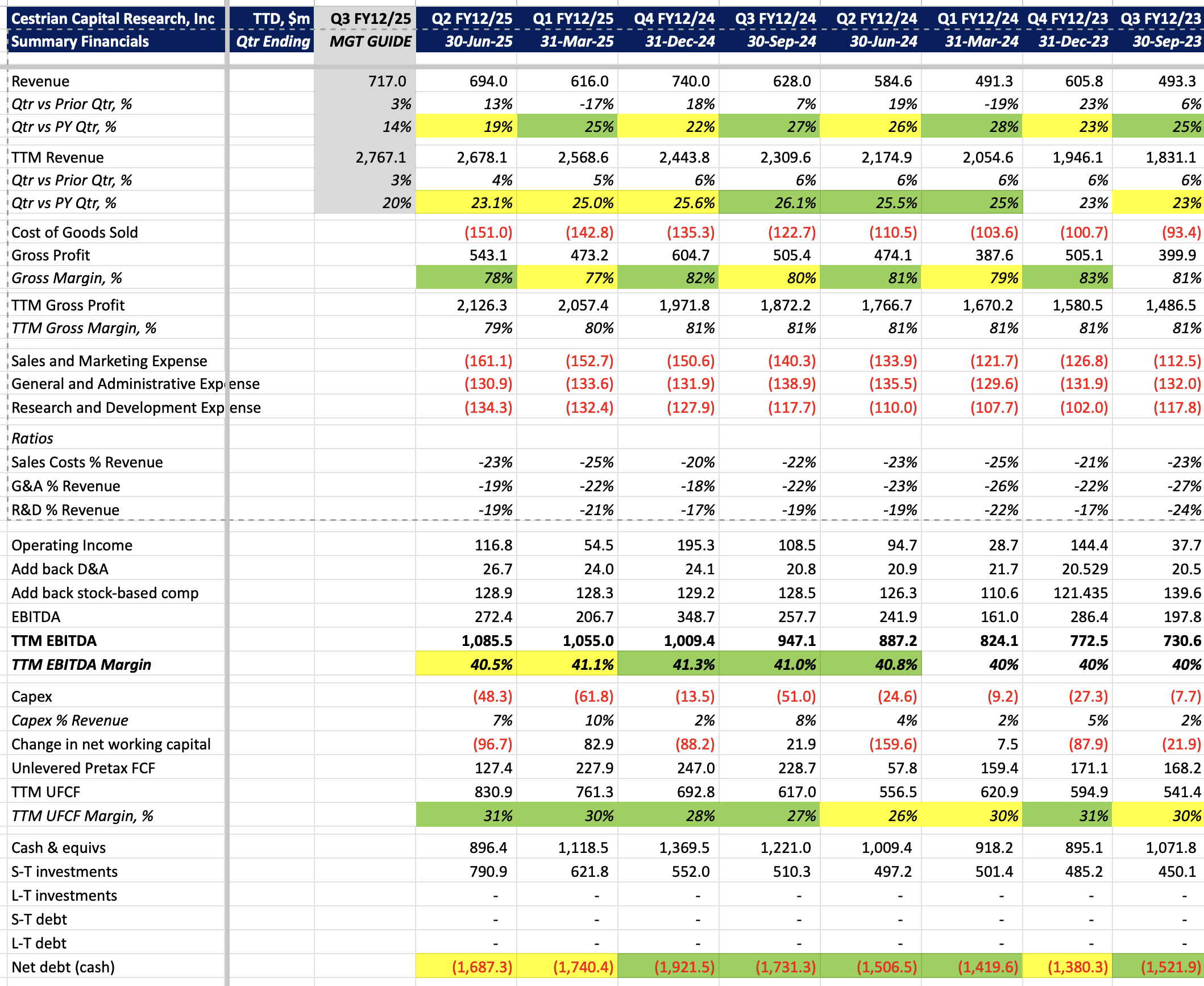 Cashflow margins moved up a tick to 31% on a TTM UFCF basis, and the balance sheet has $1.7bn of cash & short-term investments with no debt whatsoever.