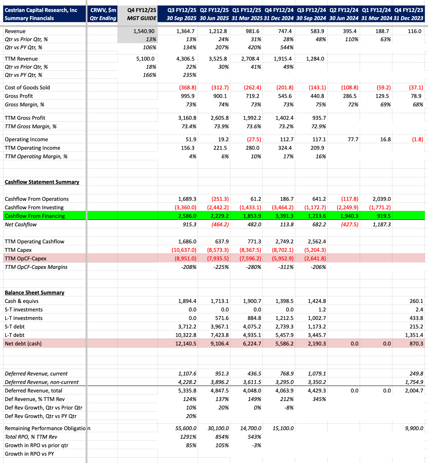 CoreWeave isn’t going to make it in my view. I believe it will be one of the first casualties when the market turns down for real. The company has $12bn of net debt being (not) serviced by negative TTM cashflows of $9bn. Which by the way get more negative each quarter. The only thing keeping this company alive is regular cash infusions from debt and/or equity issuance.