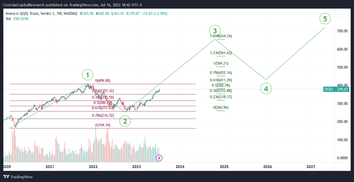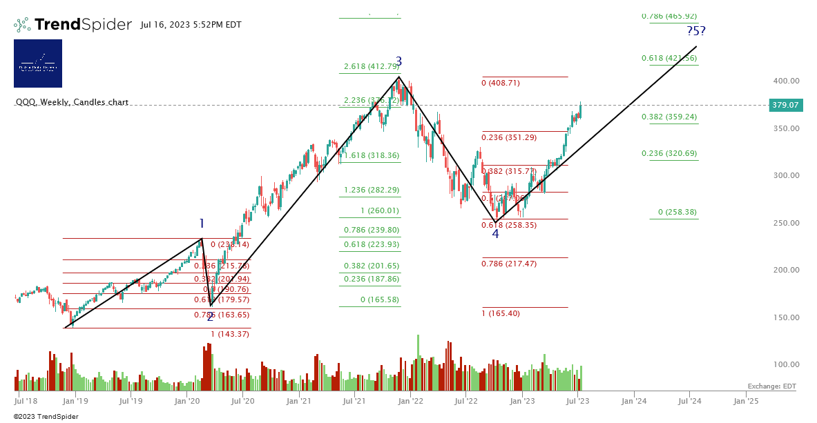 Textbook Elliott Wave & Fibonacci extensions / retracements - right? So the Qs are in a Wave 5 up that ought to finish somewhere in the mid to high $400s before a significant correction of that whole move up since the 2018 lows. What would cause that correction? A deflationary bust? A war with China over Taiwan? A tactical nuclear event in Europe? Who knows. Something big.