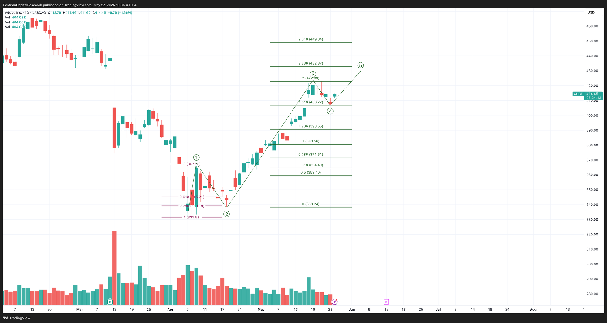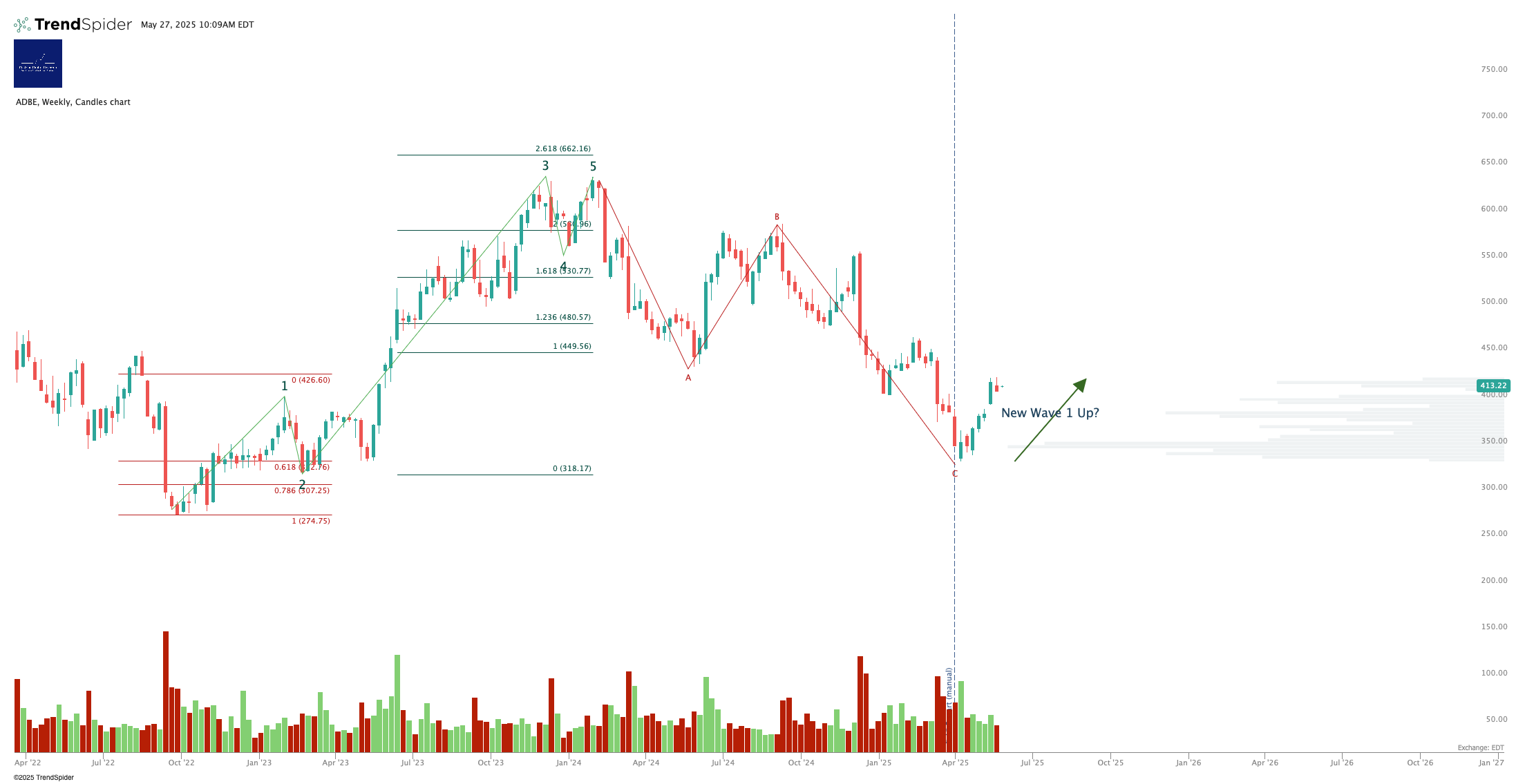 The move up from the post-Liberation Day lows looks to me like a possible new, impulsive Wave 1 up. If so, we will see a partial retrace of that move in a Wave 2 down at some point. And if that Wave 2 low were to hold somewhere between the .5-.786 Fib retrace of the Wave 1 up - that would be a buy signal in my view. (If you’re a subscriber of ours, keep watching the updated charts to see if this happens). For now we rate ADBE at Do Nothing; if we got that Wave 2 retrace that held in that zone, we would likely move to Accumulate. Until then, plenty of stocks that one can buy that don’t have existential threats hanging over them.