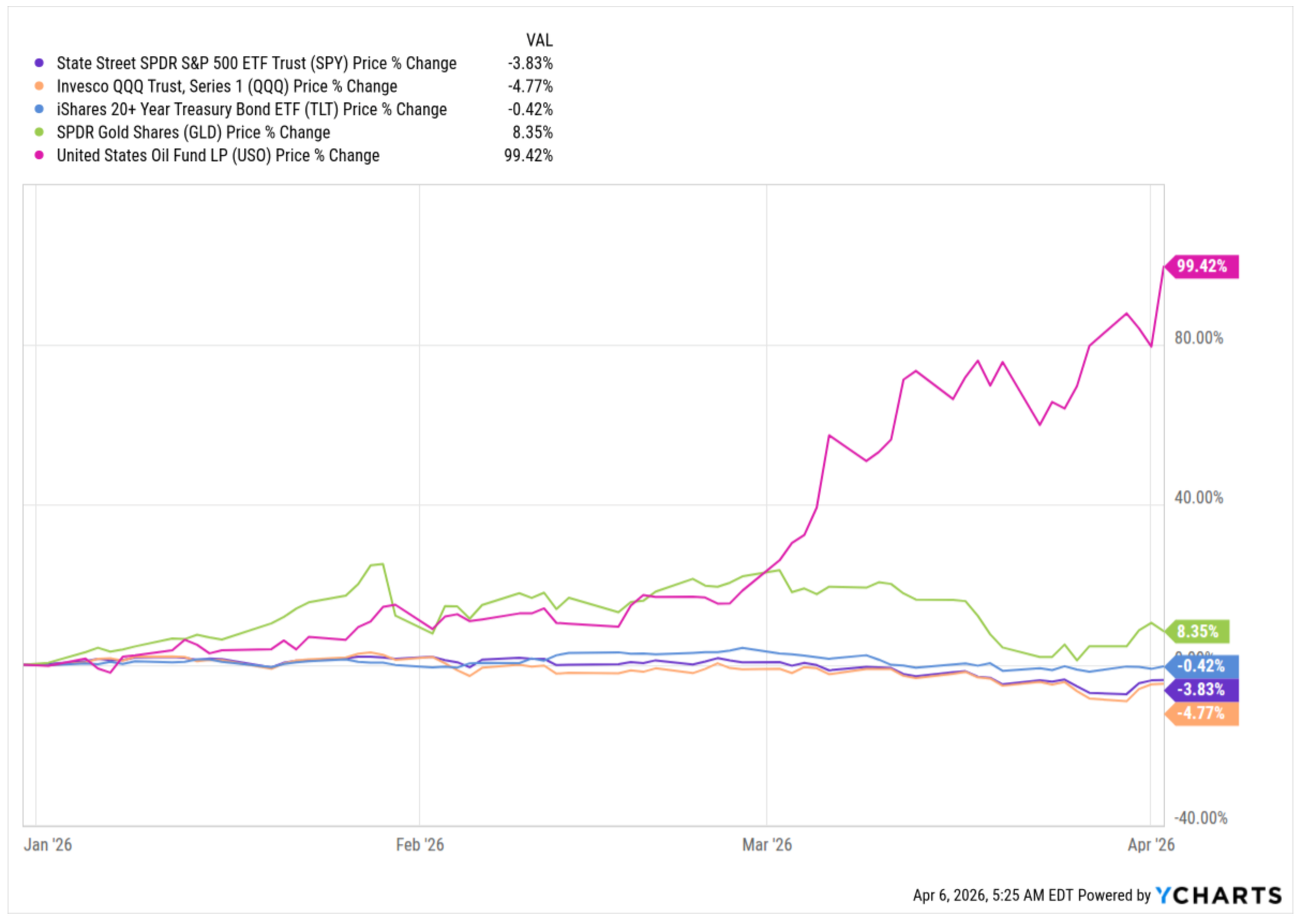 If you have been expecting this market to crash because of the war, you have been sorely disappointed so far. Looking on a 2026 YTD basis, oil is up hugely of course, and equities are off their highs. Gold is up a little. The most important bond ETF is flat. If you knew nothing about anything you would say there appears to be something very stressful going on in the oil market which thus far has not spread to other markets.